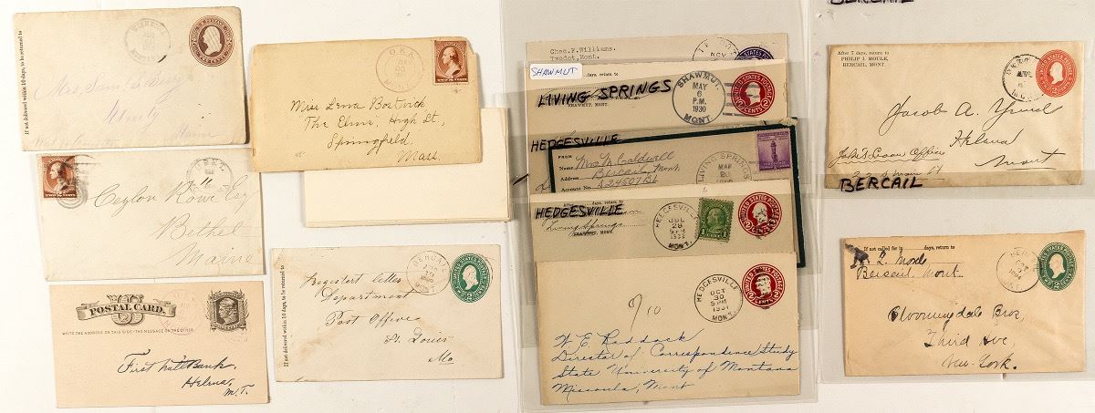Lot of twelve. 1) January 25, 1885 magenta double circle. Five 31's reported in Shellen & Dunn. Includes a letter from LaVonne Hussey. 2) Very early Oka 1882 #1 on a postal card. 3) 1882 Ubet #1 (two listed in Shellen & Dunn). Very early (post office opened in 1881). Date is manuscript. 4) Winnecock 1885. Four listed in Shellen & Dunn. Post office opened the same year. 5) 1890 Bercal. First year of statehood. Also Hedgesville, Twodot, and Living Springs. (Svoboda Collection) City: Wheatland County State: Montana Date: 1880's - 1930's HWAC# 30936