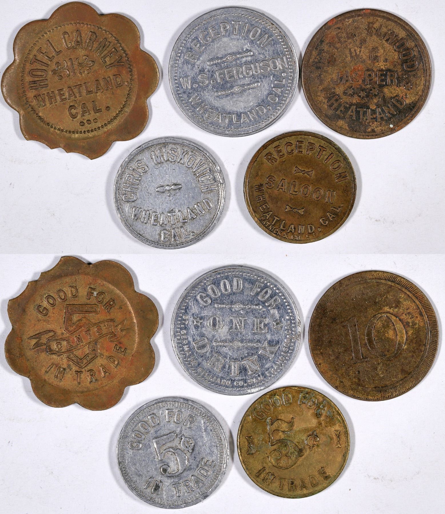 Lot of five tokens from the Yuba County town of Wheatland: 1) HOTEL CARNEY / WHEATLAND, / CAL. // GOOD FOR / 5 / CENTS / IN TRADE; Br., Sc(8), 30 mm. 2) HOTEL ELWOOD. / W.G. / JASPER. / WHEATLAND. // 10; Br.rd., 25 mm. 3) CHRIS MISKOVICH / WHEATLAND / CAL. // GOOD FOR / 5¢ / IN TRADE; Al., rd., 21 mm. 4) RECEPTION / SALOON / WHEATLAND / CAL. // GOOD FOR / 5¢ / IN / TRADE; Br., rd., 21 mm. 5) RECEPTION / W.S. FERGUSON / WHEATLAND, CAL. // GOOD FOR / ONE / DRINK / ST. GERMAIN BILLIARD CO. SAN FRANCISCO, CAL; Al., rd., 25 mm. Ex Ron Lerch collection.