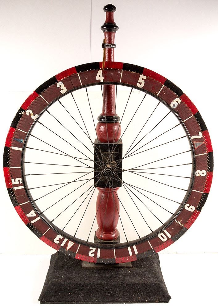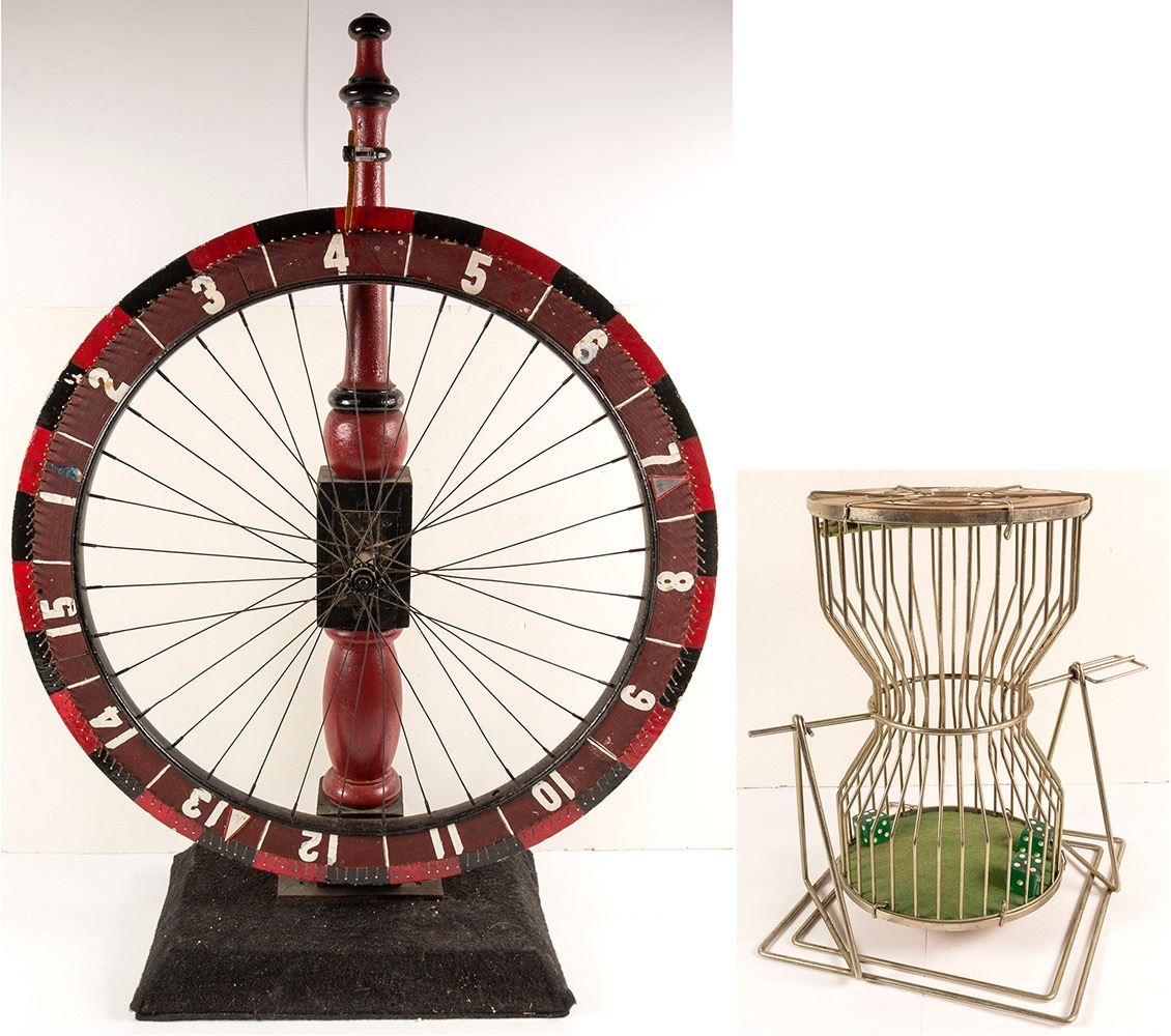 Wheel of Fortune 43.5" x 31.25" x 12". Numbers 1 - 15 on red and black wood wheel with metal spokes on wheel and leather pointer. Chuck-a-Luck 17.5"x 12" x 12" metal cage, three green dice 1.25" dice. There is green felt lining inside of cage. HWAC# 51400 Date: Location: