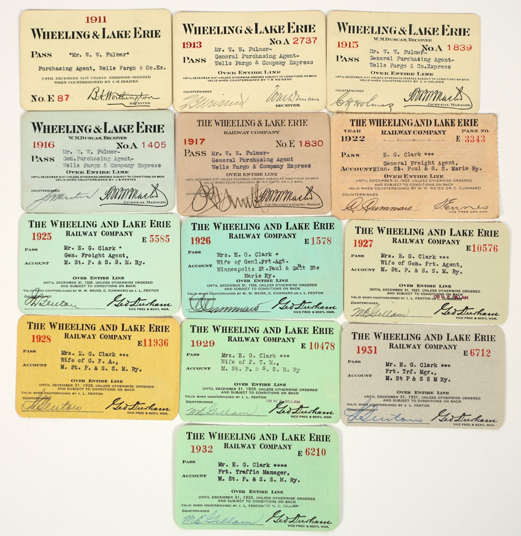 Group of 13 railroad passes from the Wheeling & Lake Erie Railroad. Passes date from the early 1900s; see photos for specific years and additional detail.