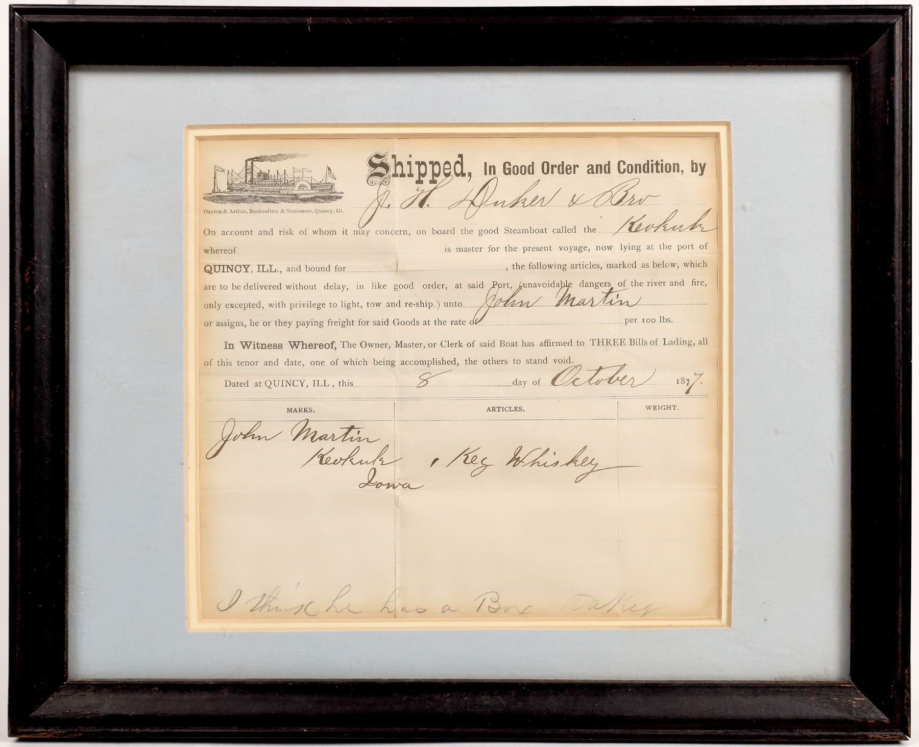 1877 Whiskey bill of lading in frame, shipped from Quincy, IL. Steamer vignette. Frame 9.5x12".