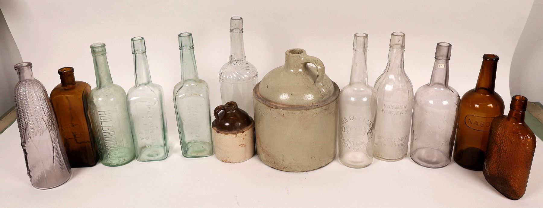 Nearly three dozen bottles & crocks. Jones-Paddock (backwards J) SF; Peruvian Bitters (sm chip); Nabob (top ground); Haydock Rye; Haymen; Old Gilt Edge (chip); Towle Log Cabin (chip); corn on the cob clear figural (nice); 15 other no0 name whiskey flasks etc; 3 large "corn liquor" crocke3ry jugs and one small one, no name.