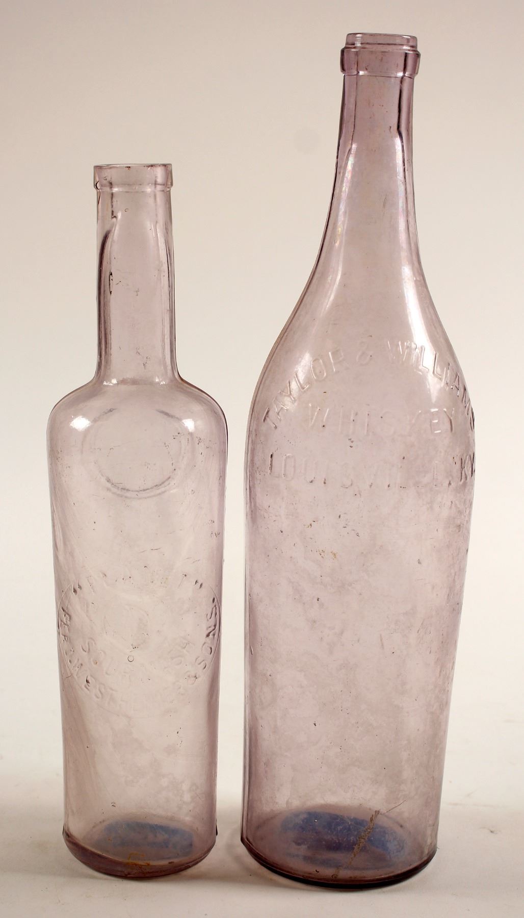 Item #1 of 2: Taylor & Williams ( cu ) / Whiskey / Louisville, KY. // Light ,sun colored amethyst, eastern whiskey bottle. 12 1/2" tall, narrow band, tooled top. Bulbous shoulder, that tapers smaller in the body. Dug specimen, with a 1 1/4" front base scratch that needs to be buffed off. Overall light haze, but no form of damage. Item # 2 of 2: " Planet " ( cu ) // 18/ Motif within circle: half moon, facing left / 75/ Sour Mash ( cd ) / Fred. Westheimer & sons. ( ad) //Base embossed : WB ( Joined together ) //Light , sun colored amethyst. 10 1/2" tall, square collar top, tooled lip. Reverse : " 1" top end opened, horse shoe space for label, like a punch back. Dug specimen, with a 5 " area of side scratching, and a 1/8" lip flake. If tumbled, would be mint . But, here is the strange part. The bottle is shaped like an olive oil bottle , What ? I have never seen a whisky , in that shape, in 46 years , have you ? A nice pair, of strange looking bottles . ( RH ).