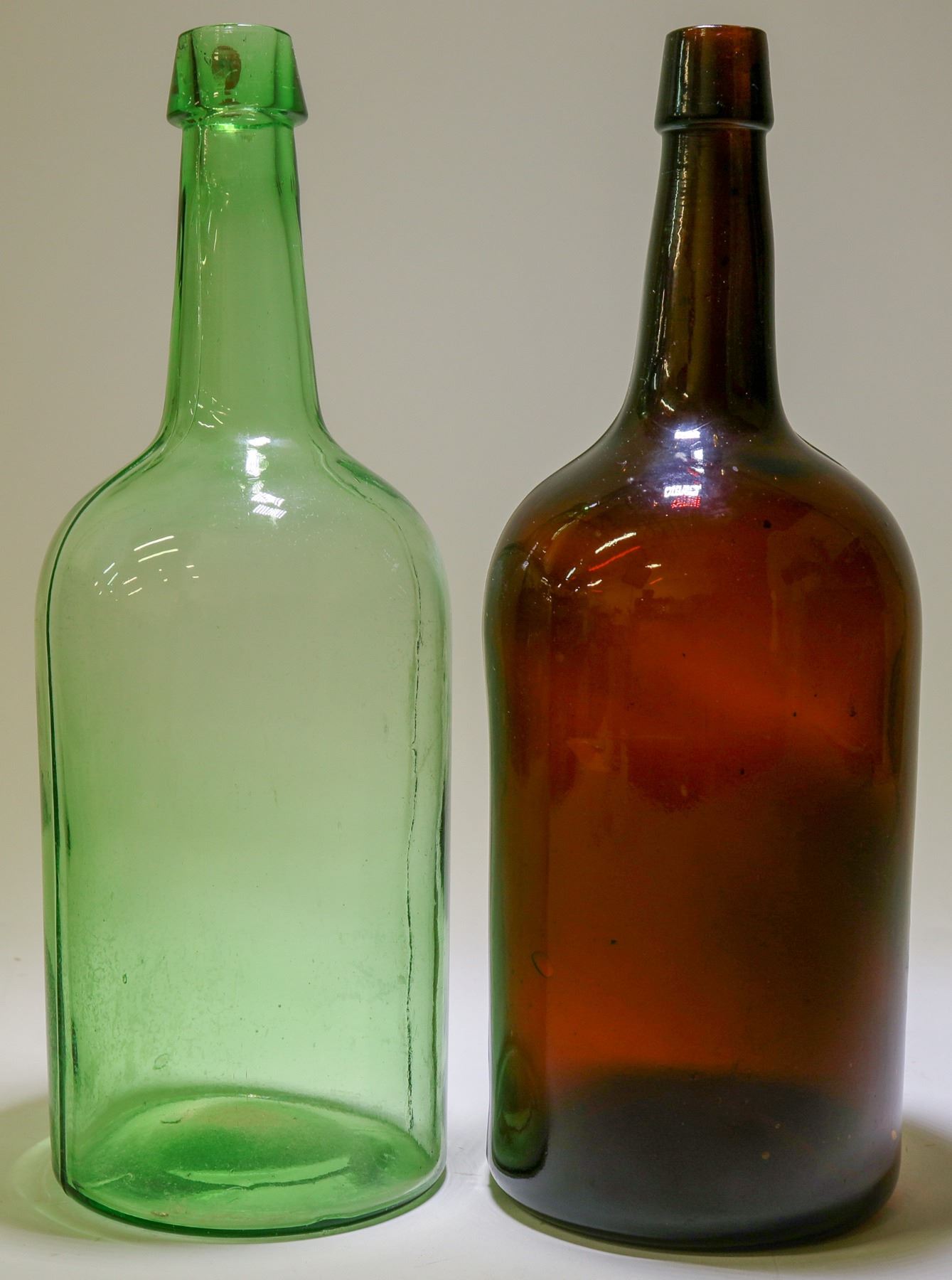 item #1 of 2 : Beautiful, light 7up green... demijohn whiskey bottle. 13 1/4" tall, long tapered collar, tooled lip. Perfect condition, except for some minor haze, that would wash out. Extremely rare in this color. Over 5" long bubble in the neck !! Item # 2 of 2: Same type of bottle. Deep reddish orange amber. 13" tall, and also in perfect condition. It also has extra glass, from the previous bottle blown in the mold, stuck on the base. Beautiful pair of bottles for your centerpiece in the table, or your fireplace mantel. (RH).