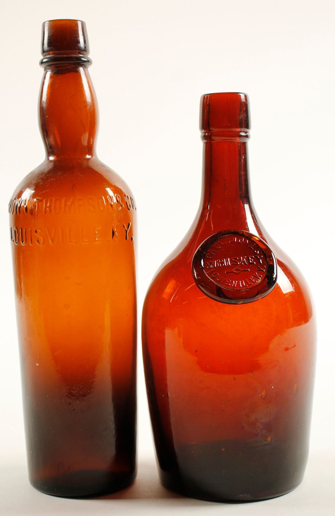Item # 1 of 2: Embossed at the shoulder is : Brown & Thompson & Co. / Louisville , Ky //. Base embossed : F.C. G. Co // Medium, beer bottle amber, whiskey fifth. 10 3/4" tall, long tapered collar with oversize ring, Applied top. High shouldered , with short lady's leg neck. Fairly clean bottle, with minor bits of haze. There is a 1/4" size, pot stone crack in the left shoulder, but it can not be seen when displayed straight on. Also, really nice 1 " x 1/4" in size, bubble behind the letter " S" in the city name " Louisville ".There are also a few other nice bubbles, in this specimen. Item # 2 of 2: Embossed on the front shoulder of the bottle, in an "1 3/4" wide, Applied Seal" is: Paul Jones ( au ) / Whiskey / Motif: Lined diamond design / Louisville , Ky. ( ad). // Medium orange amber, squat turn mold , southern whiskey bottle. 9 1/8" tall, long tapered collar with ring , tooled top. Perfect condition with a very minor inside haze. Just needs to be cleaned, to sparkle. Very nice pair of southern whiskey bottles, in different colors and shapes. Nice Mantle pieces !! ( RH ).