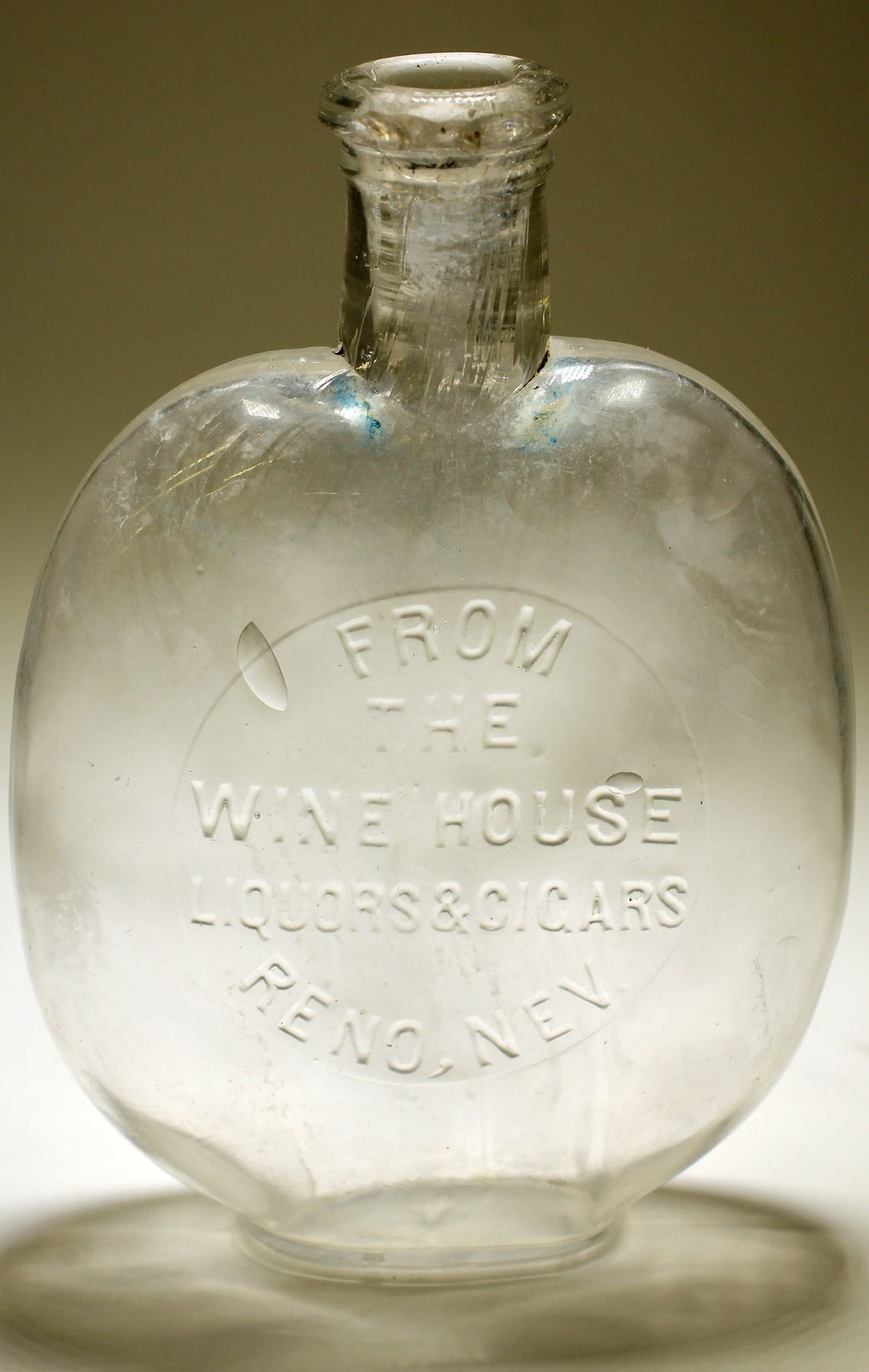 Straight out of the west...From/ The / Wine House/ Liquors & Cigars / Reno, Nev ( ad) // Clear, pumpkin whiskey flask. 5 1/8" tall , double collar top, tooled lip. This specimen is one of the rarest embossing patterns, for this bottle. Has a light haze, but never been cleaned. Also, very shallow , 1/2" lip bruise very hard to see without a 10x eye piece. A great pumpkin seed flask, for the price... ( RH ). Fred Holabird Collection