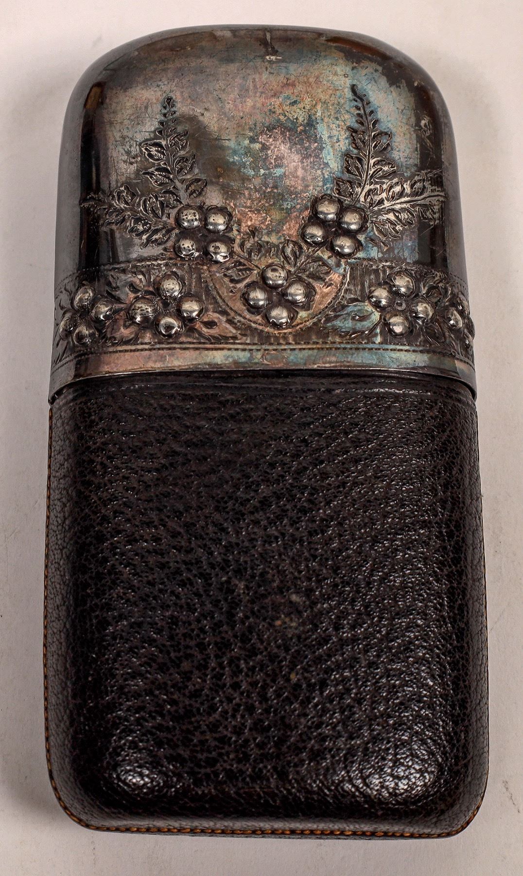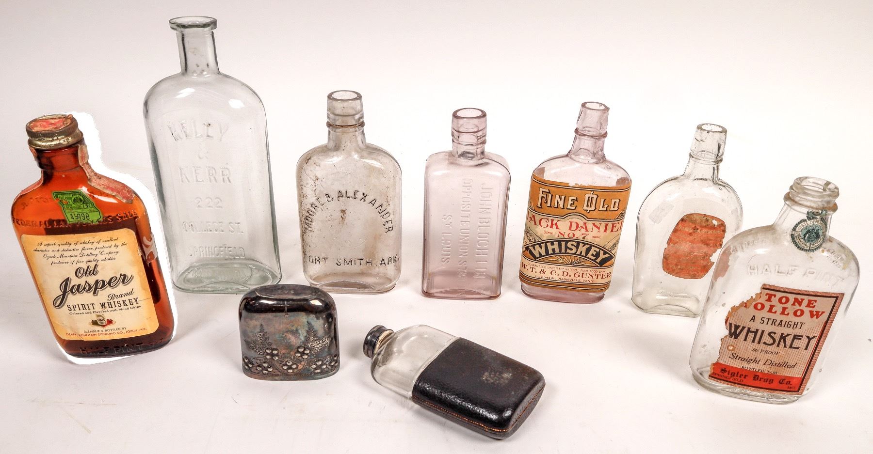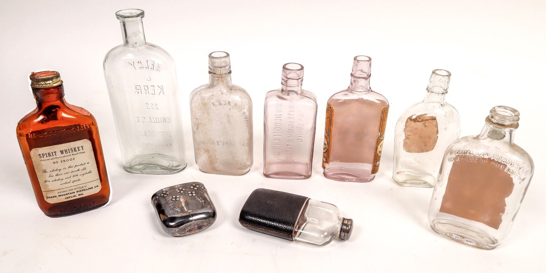 8 different Whiskey mostly 6.5" flasks. 1 black leather with metal cap. 2 embossed, 4 paper labels. TN, St. Louis, Springfield, MO, Joplin, Mo.