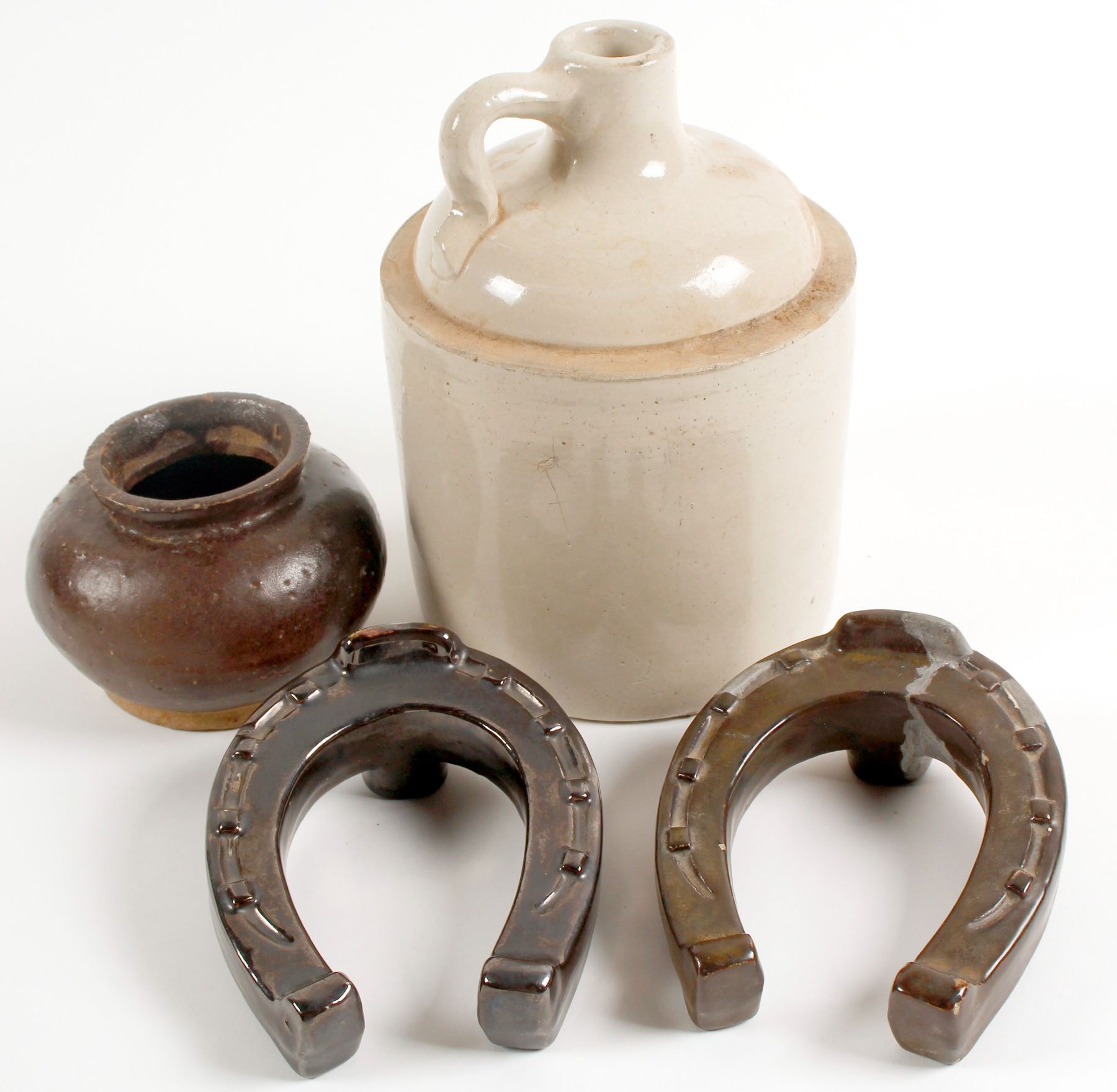 Item # 1 of 4: Beige colored , handled whiskey jug. 8 1/2" tall x 5 3/4" wide at the base. Base embossed : Malcolmb Stoneware Co.( au) / Malcolmb// Perfect condition , except for a flake at the shoulder rim, 5/8", very shallow. Item # Item #2 of 4: Very rare, dark pottery, horse shoe whiskey bottle. 5 1/2" tall, with 8 nail heads, and mouth opening on the reverse, . Perfect condition.Item # 3 of 4: Same as item # 2, but was broken, and nicely repaired. Re- glazing needed. Item # 4 of 4: Chinese storage pot. For dried meat or grain. Chocolate brown in color with beige base trim. Perfect condition. Nice collection of pottery items, in different shapes. Would make excellent center table, conversational items !! RH).