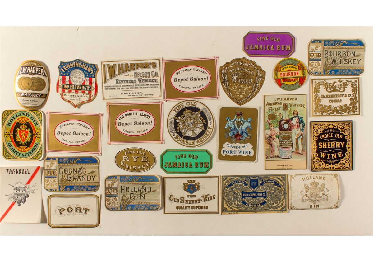 Lot of 25: colorful labels from various whiskeys, cognacs, sherry, ports, Rum, and others. Rare, and suitable for framing. Excellent condition. Date: c1880 Virginia City NV hwac 20337