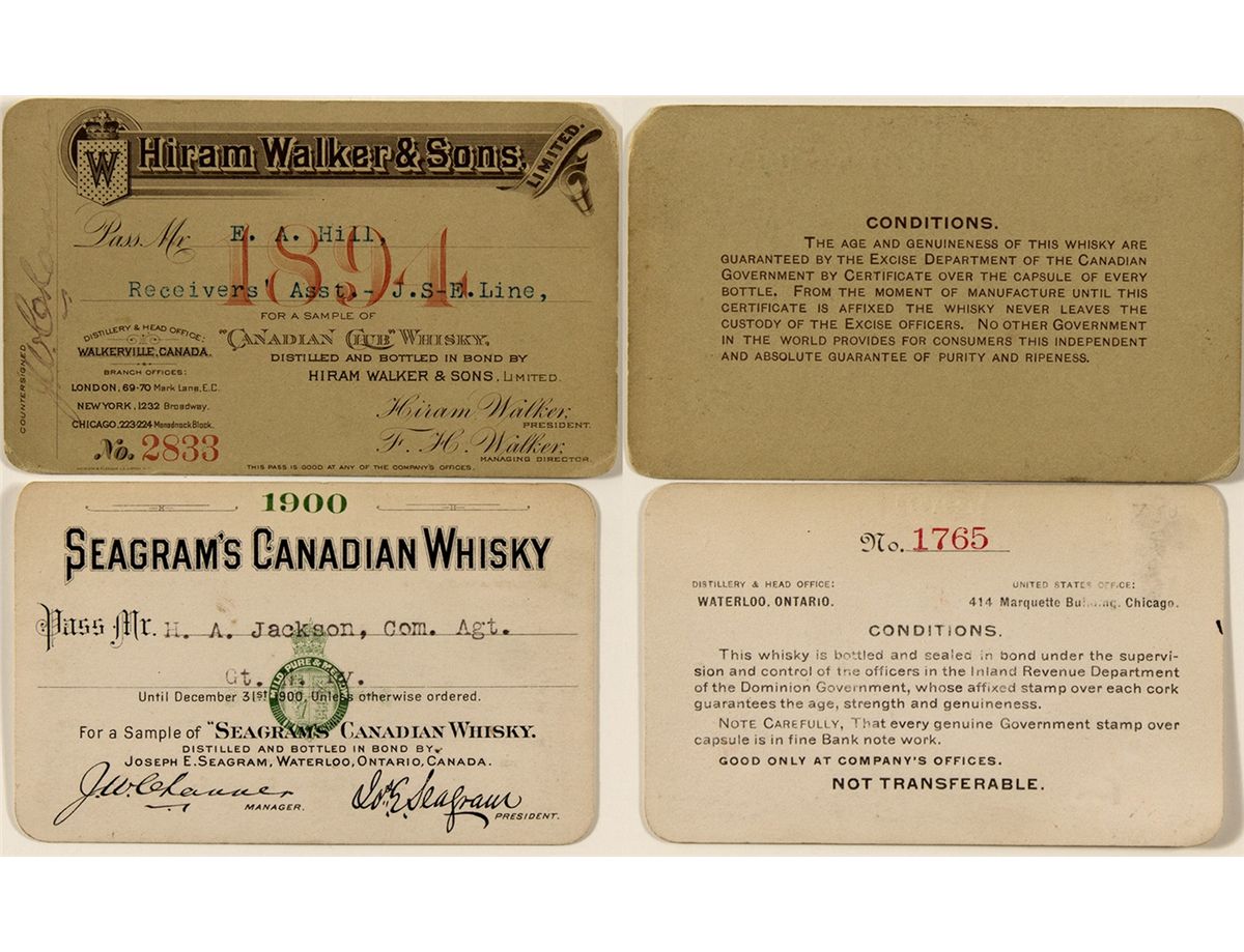 Rare pieces for you whiskey collectors out there! This is a lot of 2 passes. 1) Hiram Walker & Sons pass for E. A. Hill. Hill was a receivers' assistant for J. S. E. Line. It is pass no. 2833, and was for the year 1894. 2) Seagram's Canadian Whiskey pass for H. A. Jackson, agent. It was pass no. 1765 and was good for the year of 1900City: County: State: Date: 1894, 1900