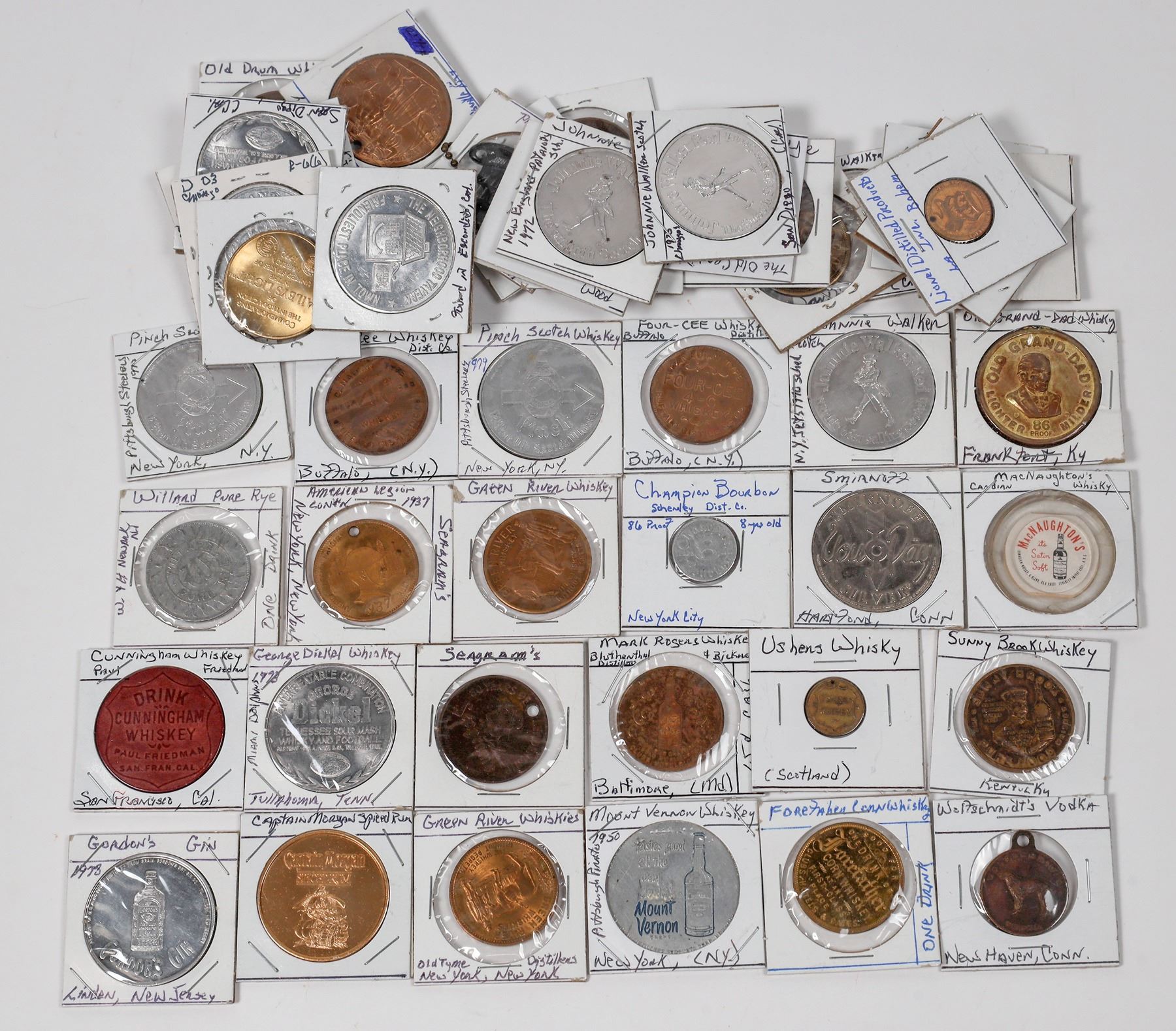 About 50 whiskey souvenir tokens. Captain Morgan, Cunningham Whiskey, George Dickel, Seagram's, Mark Roger Whiskey, Champion Bourbon etc.