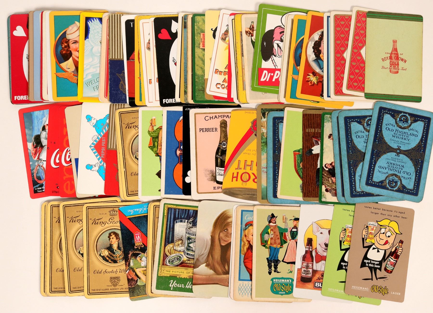 Lot of 103 vintage playing cards advertising an array of liquor and soda companies, worldwide, c1800s-1900s. Includes 35 early soda cards, such as Coca-Cola, 7-Up, Dr. Pepper, Royal Crown Cola, Cheer Up and Andrews Liver Salt Laxative; 33 beer brands from the U.S., England, Germany and more; and the rest advertising liquor, such as King George IV, Old Highland Scotch Whisky, Hiram Walker's London Dry Gin, Champagne Perrier Jouet, and more. See photos for details.