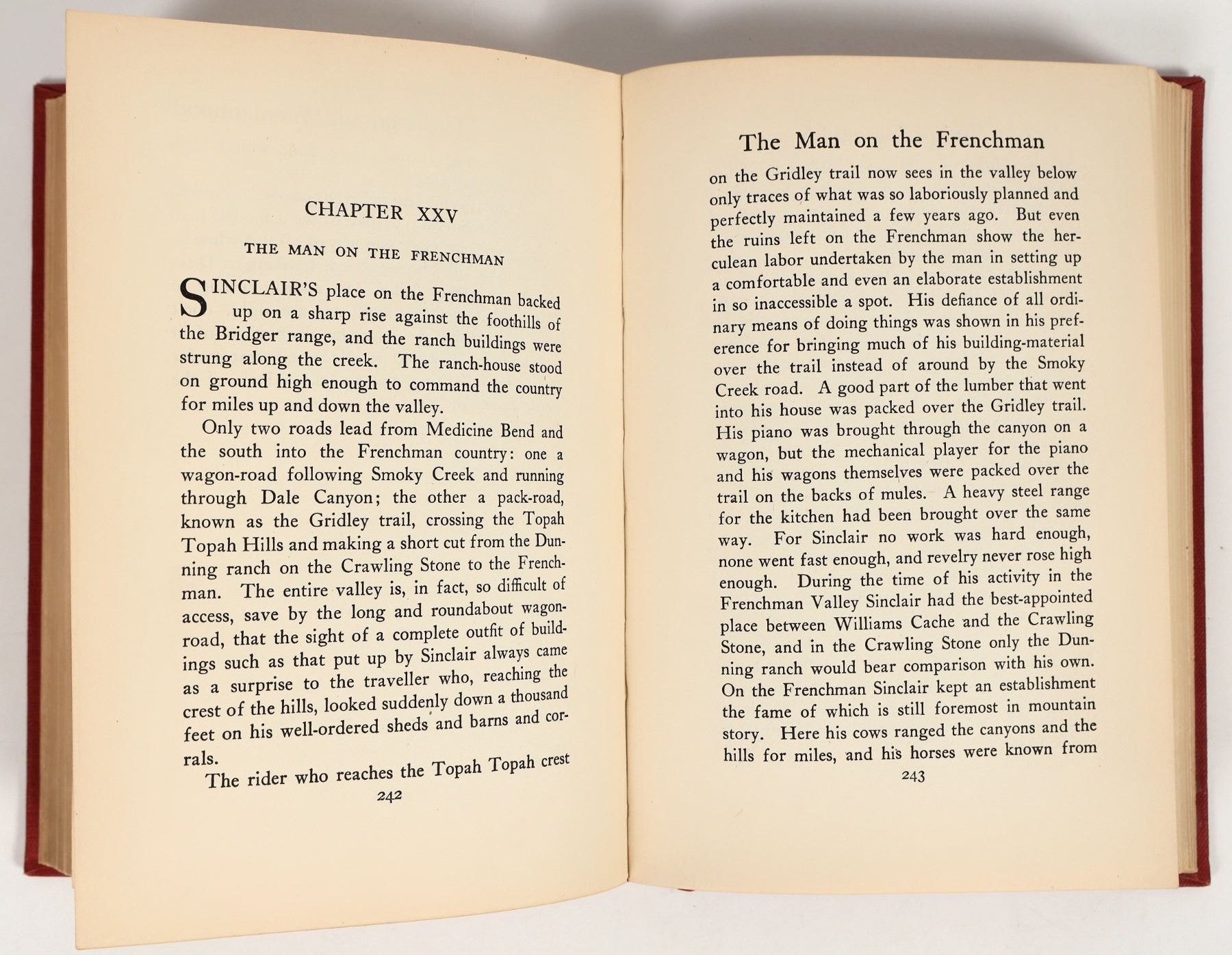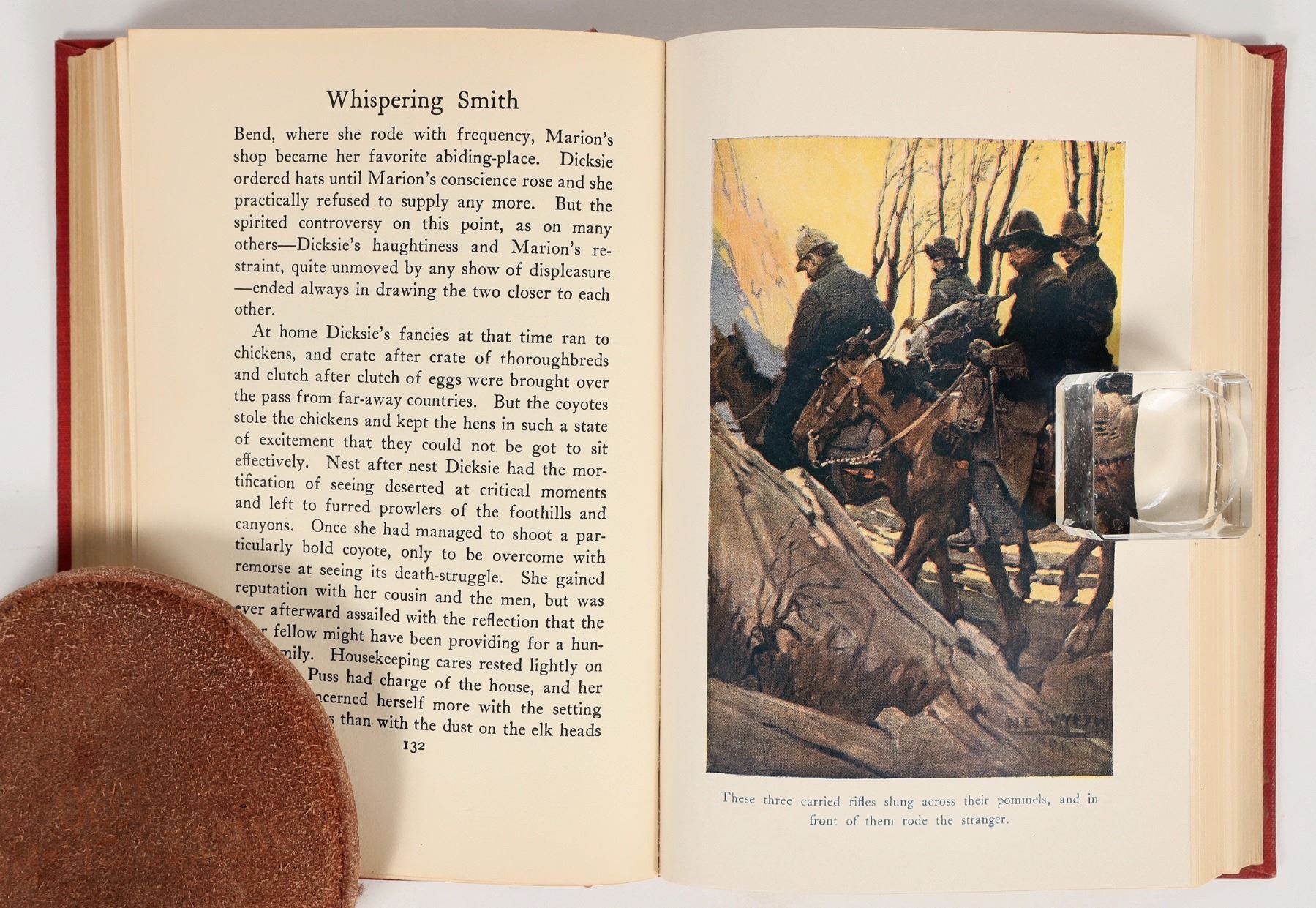 Illustrated by NC Wyeth. Published by Charles Scribner's Sons, New York. 419pp. Red hardcover. 7.5 x 5.25" A nice copy with some wear to covers and light age discoloration. Whispering Smith is an American Western novel written by Frank H. Spearman and first published in 1906. It tells the story of Gordon "Whispering" Smith, a legendary railroad detective loosely based on real-life Union Pacific agent James L. "Whispering" Smith. The novel follows Smith's efforts to bring law and order to the frontier, mixing themes of railroading, justice, loyalty, and romance. It was immensely popular in its day and helped establish the railroad detective as a heroic figure in Western literature. The book inspired numerous adaptations, including several silent films, a 1948 movie starring Alan Ladd, and a 1961 NBC television series.