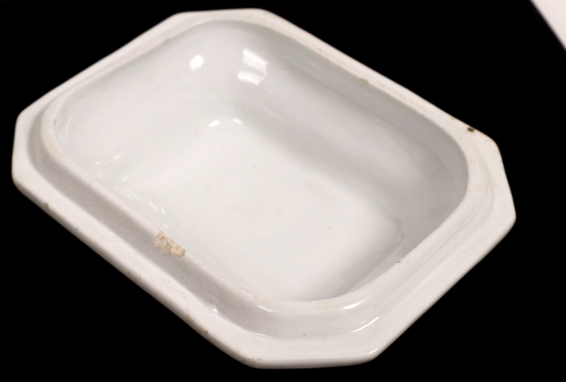 White rectangular bowl lid with four 45 degree angled corners. Lid has 4.25x5.25" lower level and 2.5x3.5" upper level. Lid top handle not present with .75" indent. No maker mark. Some light stains on top, .5" inner lip chip.