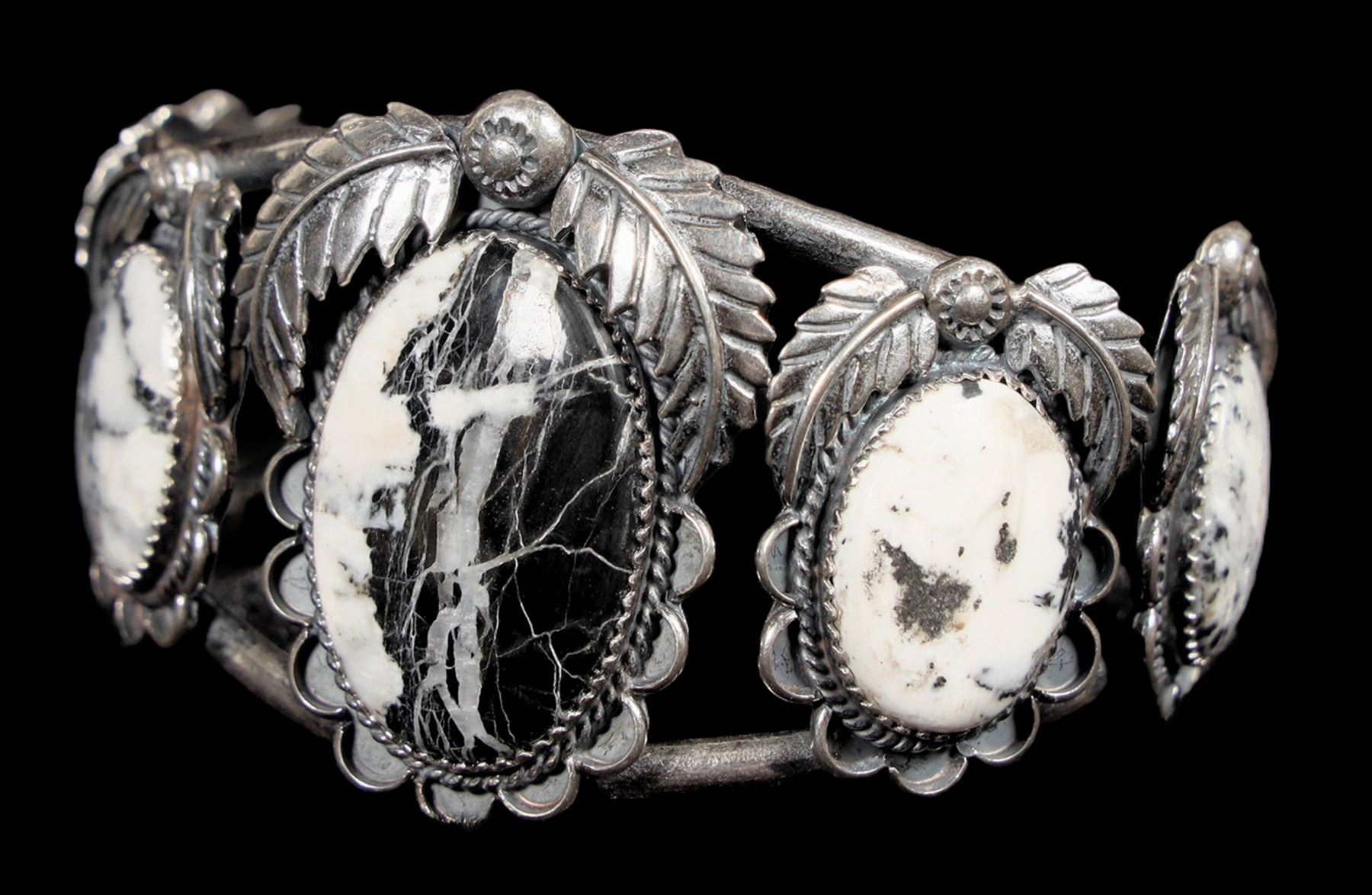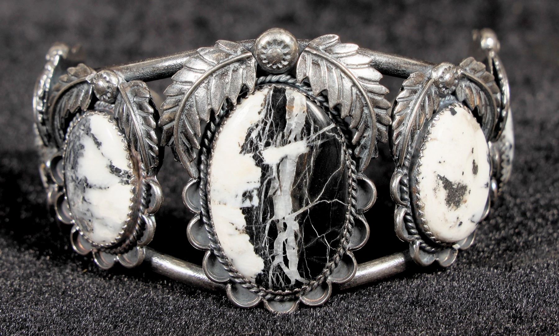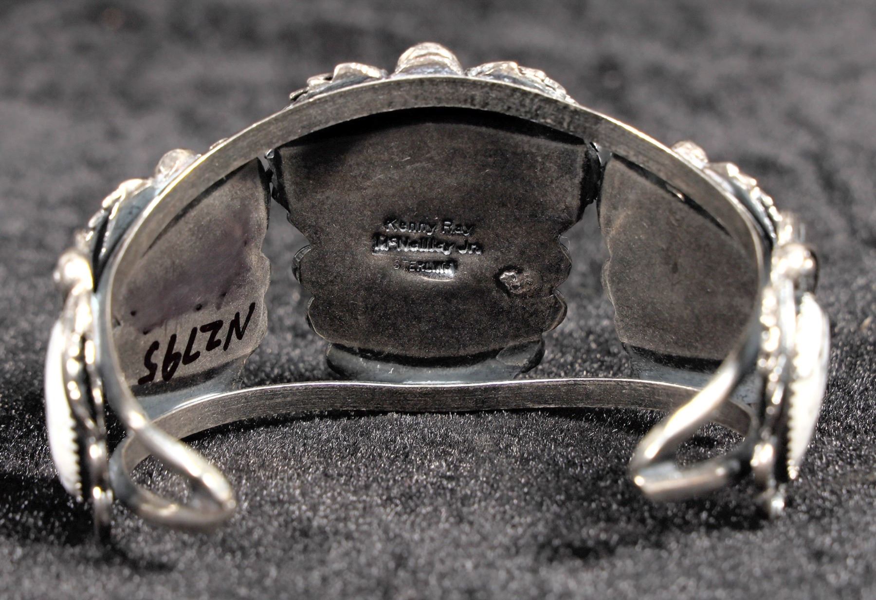 This White Buffalo bracelet would be a great companion piece to the previous lot, the stones are set in a sterling silver flower motif with the center piece measuring at 1" tall by 3/4" across and flanked on each side by two stones each measuring about 3/4" tall by 1/2" across, has an 1 1/2" opening with a 2 1/4" spread at the inside center. Piece is marked Kenny Ray McNeillay Jr.