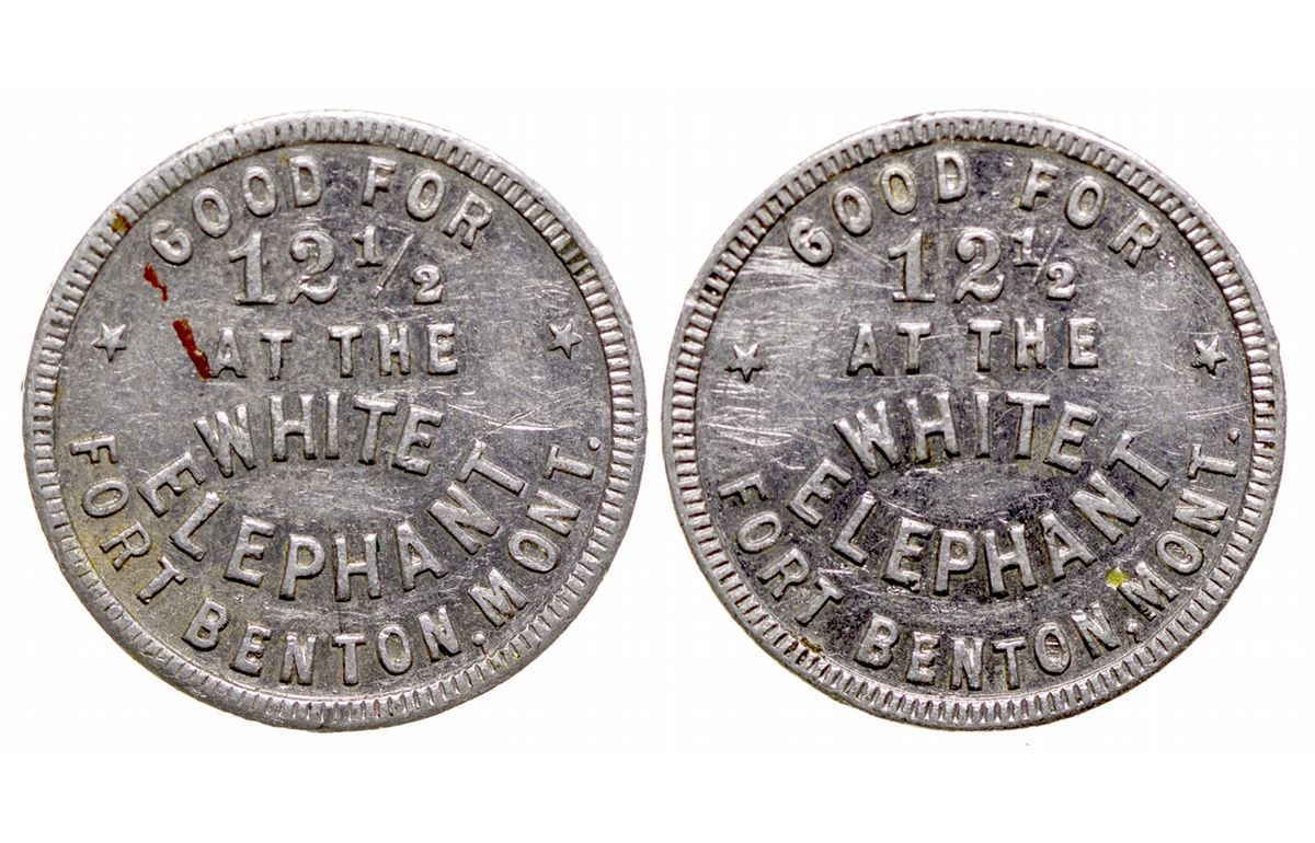 GF / 12 1/2 / At The / White / Elephant / Fort Benton, Mont. // (same as obverse). Aluminum. Round. R8. 24mm. (Svoboda Collection) City: Fort Benton State: Montana Date: HWAC# 28355