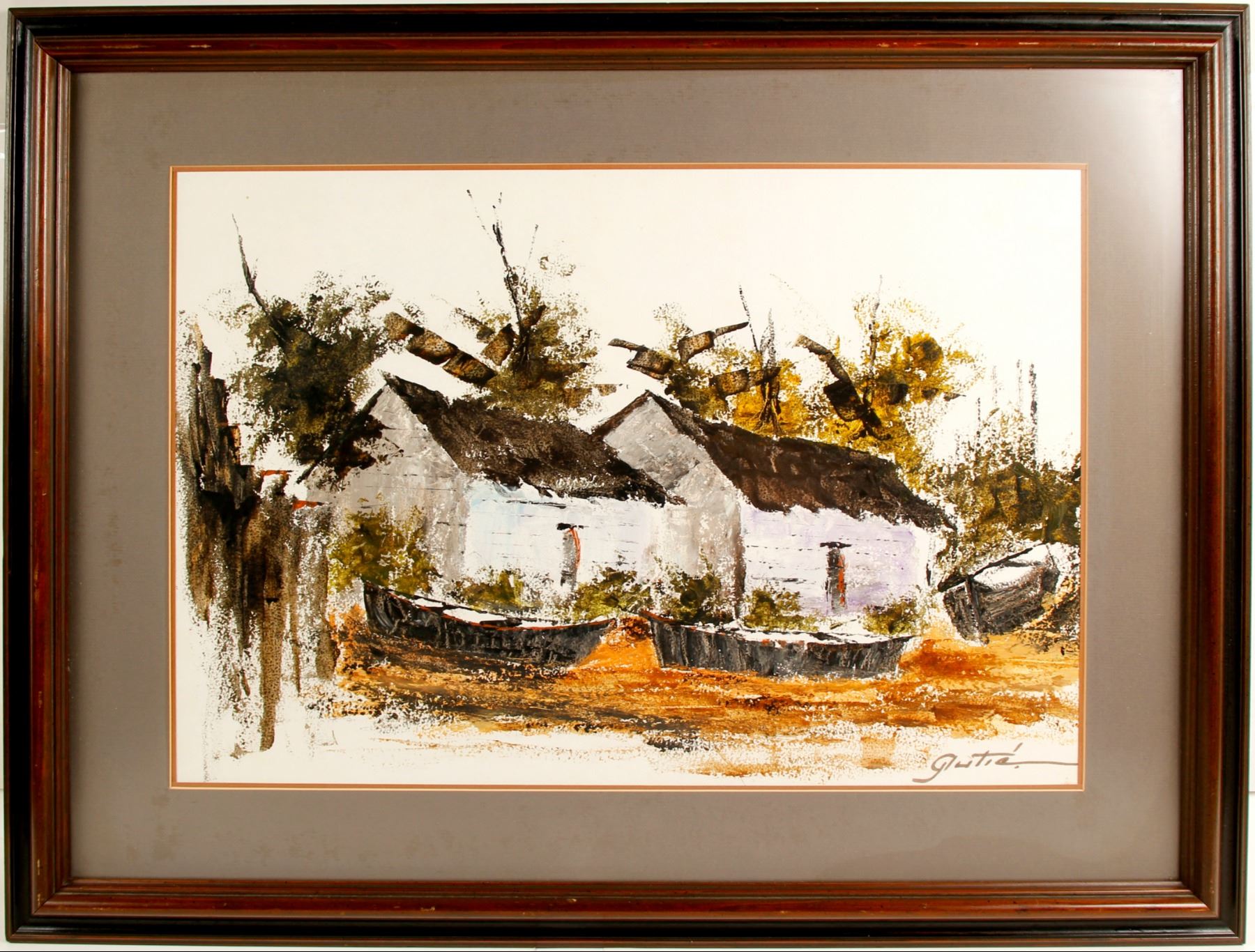 Artist Gutié's (possibly Spanish or Mexican) watercolor or acrylic painting of fishing huts, boats in foreground. Double matted and framed--27.5" x 35". Beautiful painting. State: City: Date: HWAC# 76678