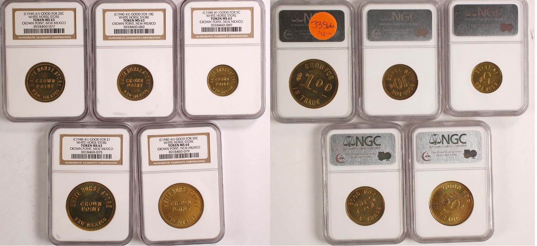 Lot of five brilliant uncirculated tokens. Good For 5c ,10c, 25c, 50c & $1.00 In Trade. All NGC MS 63, except the 50c is MS 64. Crown Point is located 20 miles north of Thoreau on New Mexico 56. State: New Mexico City: Crown Point Date: ID# 79015