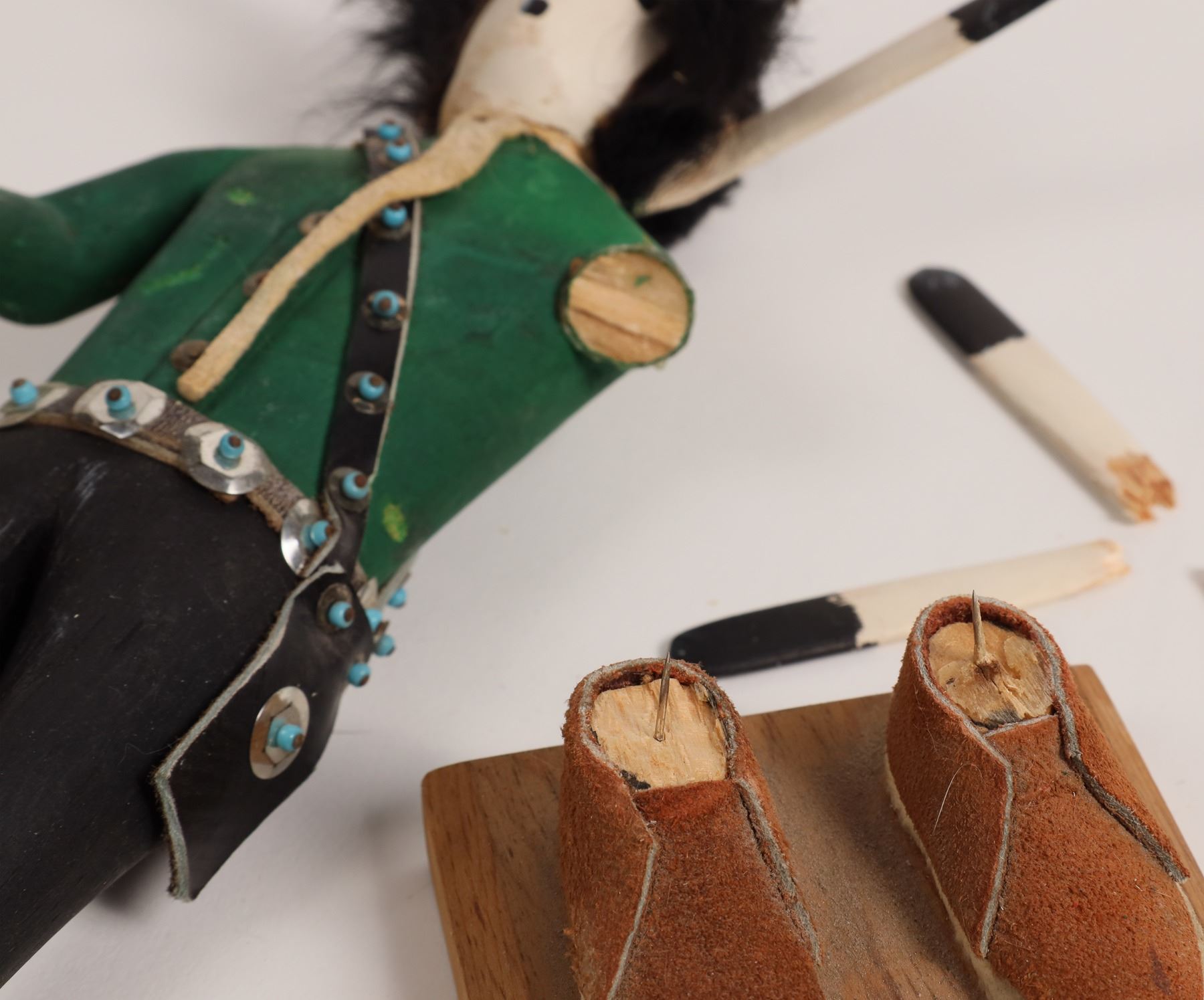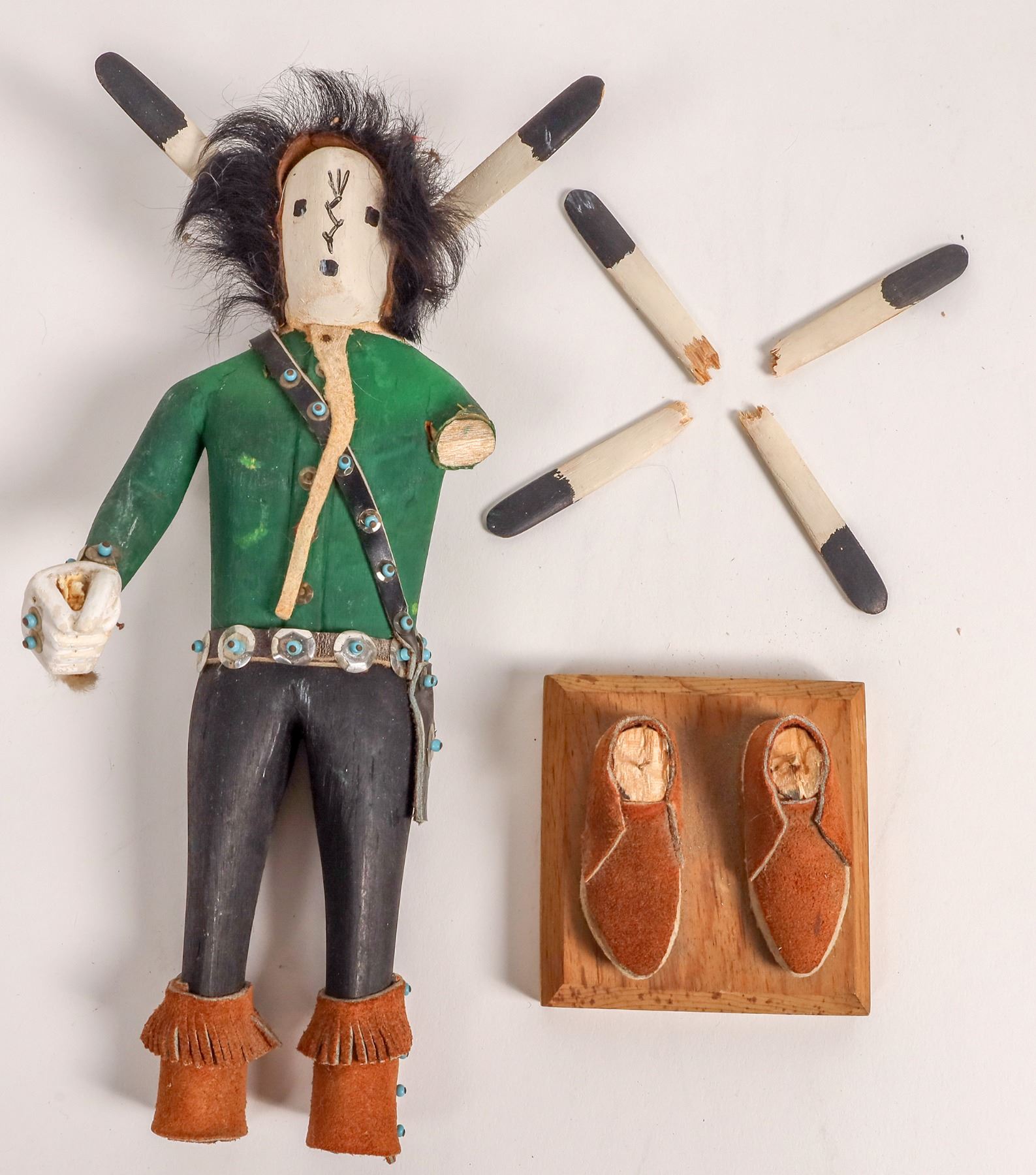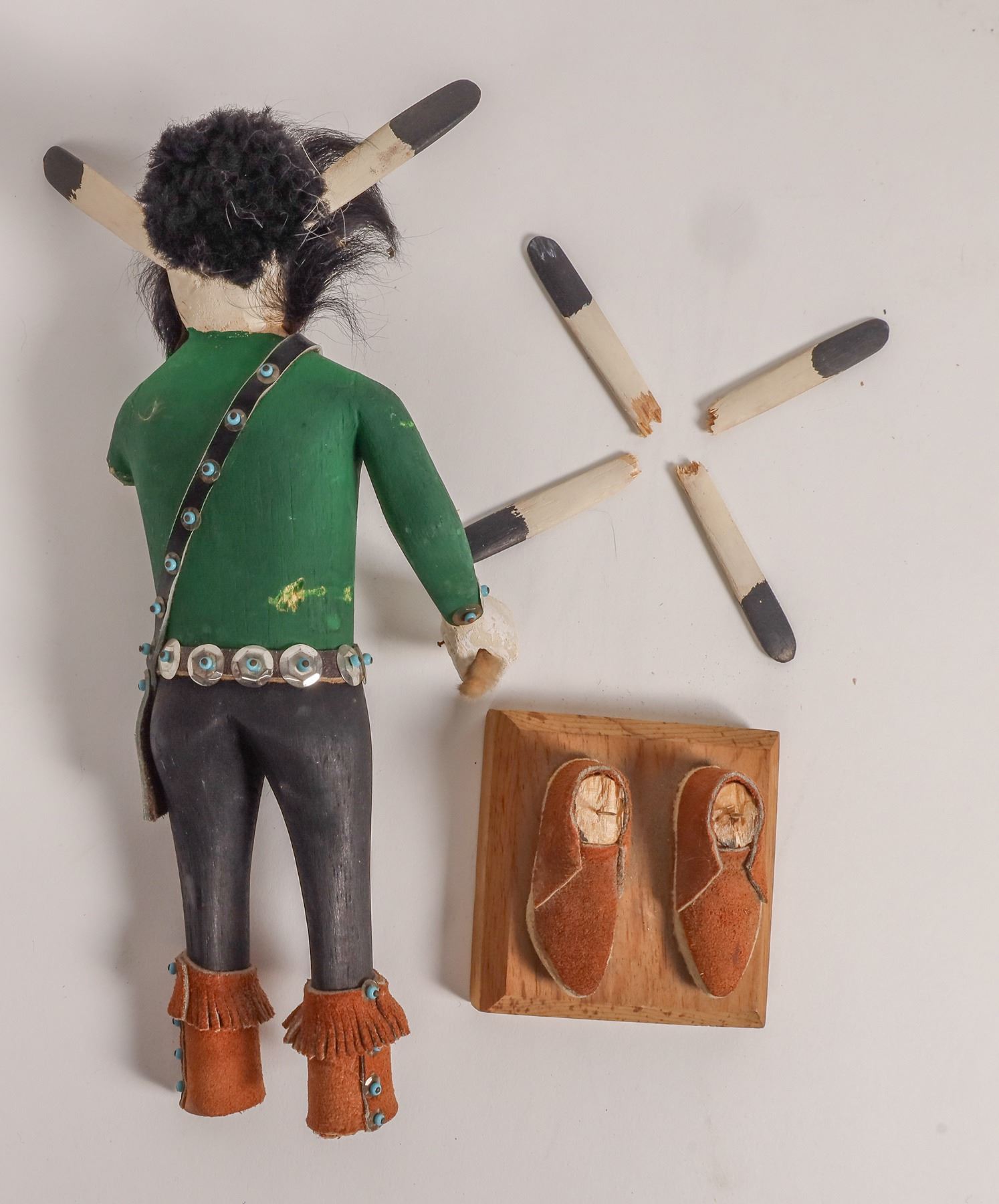 This is a doll rather than a kachina at 13 in. tall. Fashioned after the White Mountain Apache dancers with their white and black masks. This one is in fair condition with a doll separated from the base and boots which were attached with nails. The left arm is missing and the black and white headdress feathers need to be reattached by a kachina doctor (ie. a craftsman). Some scuffs in the paint. Turquoise beads attached to the belts.