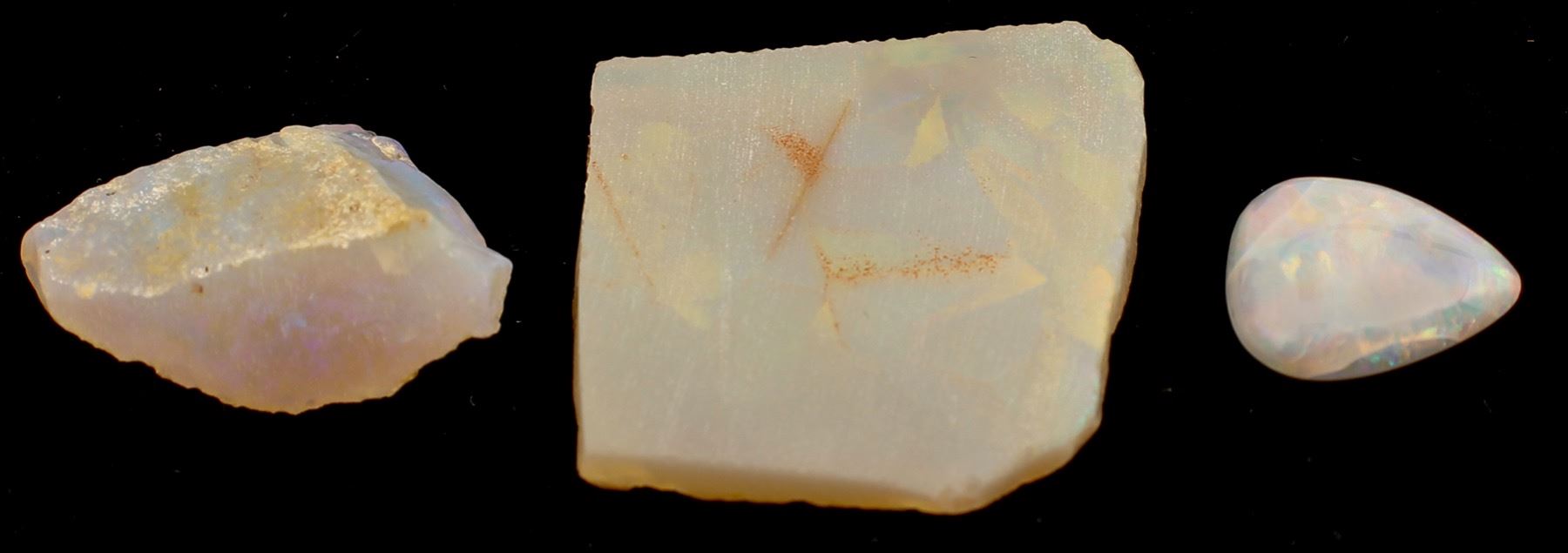 White opals are referred to as "common opal" or "potch" which has a milky or pearly luster known as "opalescence." #86 weighs 6g. #87 weighs 1g. State: Nevada City: Virgin Valley Date: HWAC# 61518