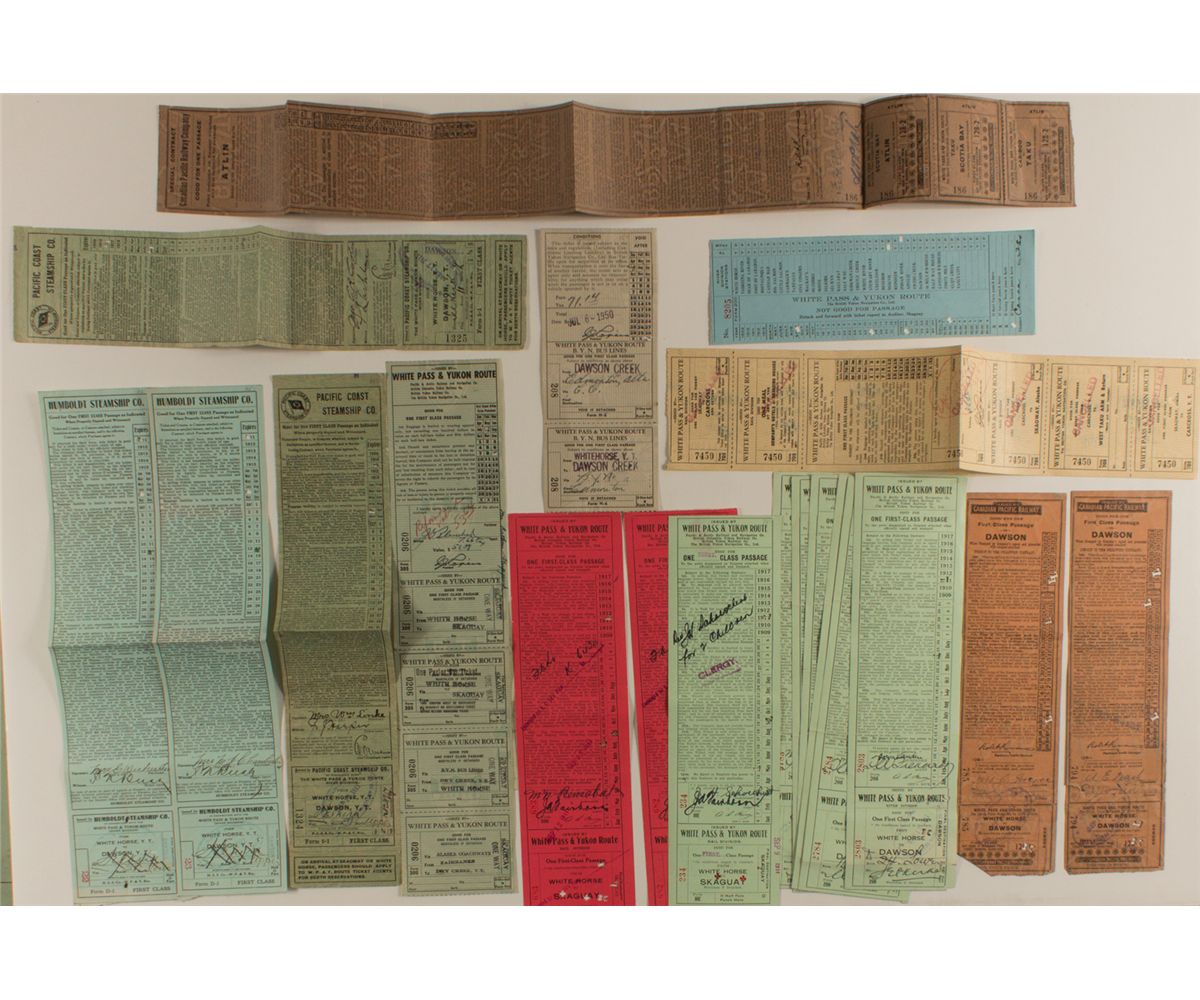 Lot of 21. All sizes and colors. White Pass & Yukon includes 1911 first class passage from White Horse to Skagway. 1911 First Class from White Horse to Dawson. One meal pass at Company's Hotel. Also Humboldt Steamship Company White Horse to Dawson on the Steamer White Horse. Canadian Pacific from Dawson to White Horse. 1911. Canadian Pacific from Atlin to Taku through Scotia Bay, 1911. 1911 Pacific Steamship Company from White Horse to Dawson. And a 1911 White Pass & Yukon Route trip pass. (Prag collection)