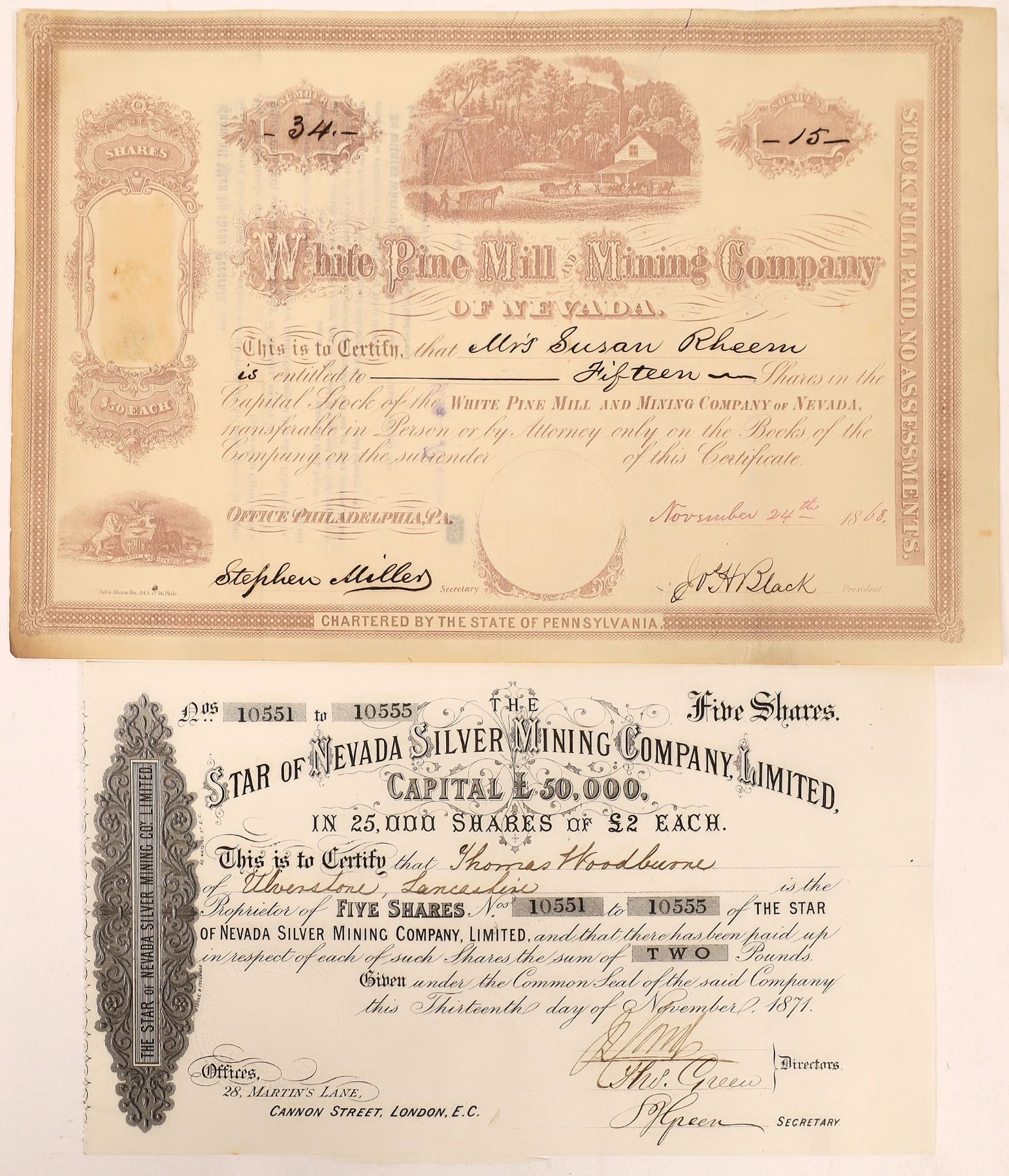 Two White Pine County, Nevada mining stock certificates: 1) Issued by Star of Nevada Silver Mining Company Limited, five (5) shares at two British pounds each to Thomas Woodbourne, signed by company directors Misters Green, and dated November 13, 1871; 2) Issued by White Pine Mill & Mining Company, for 15 shares at $50 per to Mrs. Susan Rheem. It is signed by Stephen Miller, secretary and Joseph H. Black, president. There is a scenic mine operation vignette and a double horse vignette. Please see photos for more detail and condition. Nevada