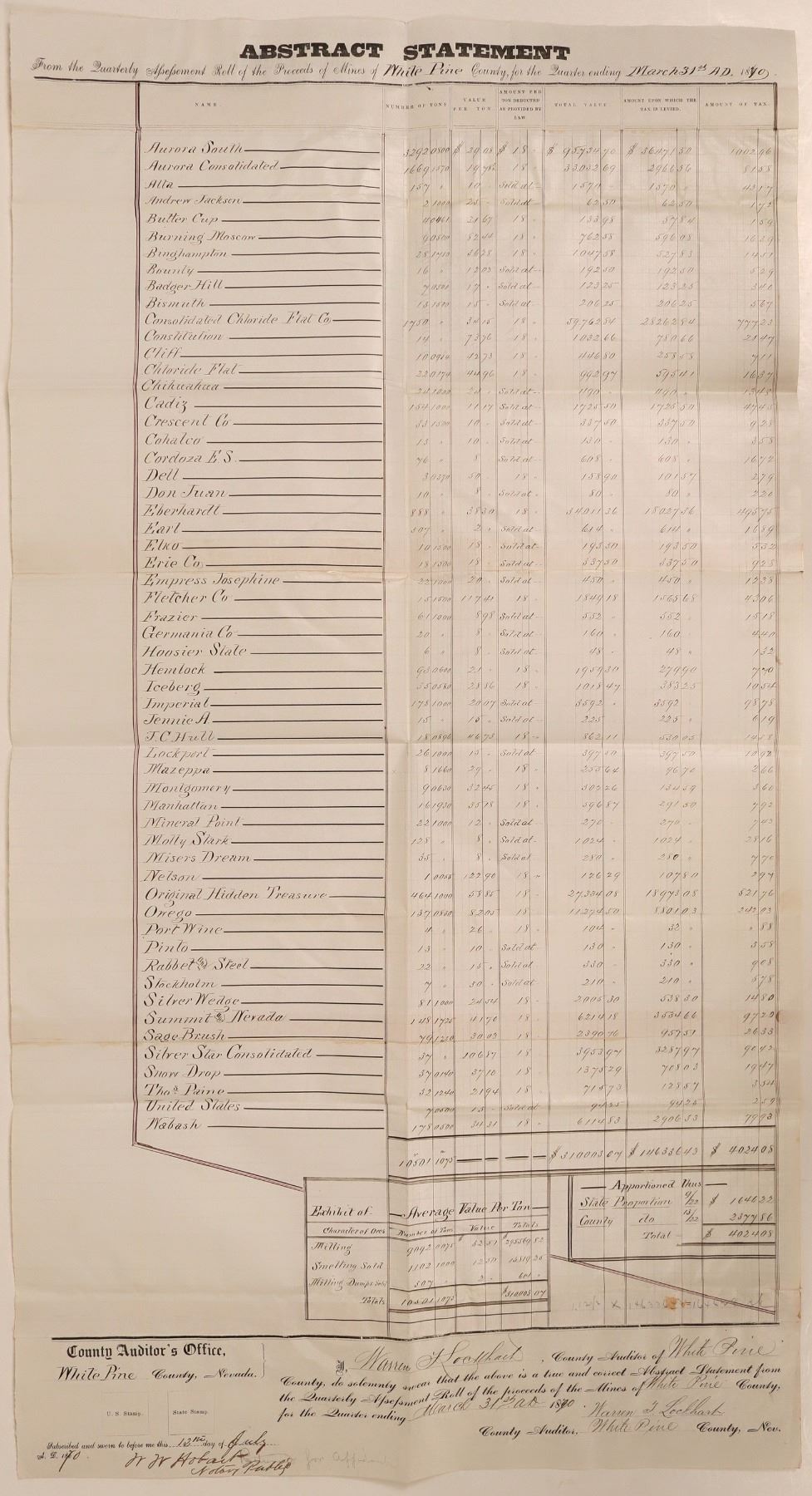 This important document is unquestionably one of the most important mine production documents we've had. It is for the first quarter 1870, at the hight of the first part of the White Pine Rush, before any consolidation took place. There are 59 different mine entries! Of these, only 24 are listed in Couch & Carpenter. $4,024 in tax was paid for the quarter on $310,003 in revenue. The average value of milled ore was $32.51, equivalent to 1.5 oz/ton gold, or about 32 oz/t silver! That is high grade ore ! The largest producers for the quarter were: Aurora South at $95,734; Consol Chloride Flat $59,762; Eberhardt $34,011; Aurora Consol $33,022; Original Hidden Treasure $27,334.