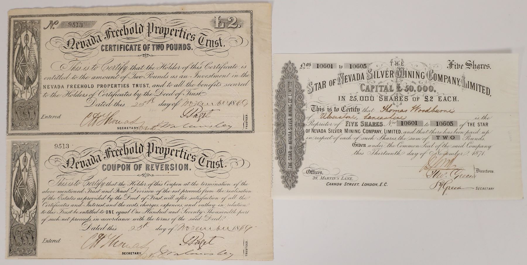 2 issued White Pine mining stocks. 1871 Star of Nevada Silver Mining, they had miniscule receipts. 1860 Nevada Freehold Properties Trust, issued in London, they may have been formed to purchase properties for the Eberhardt & Aurora Co. Not listed in Raymond or Spence. White Pine Nevada Herzog Collection