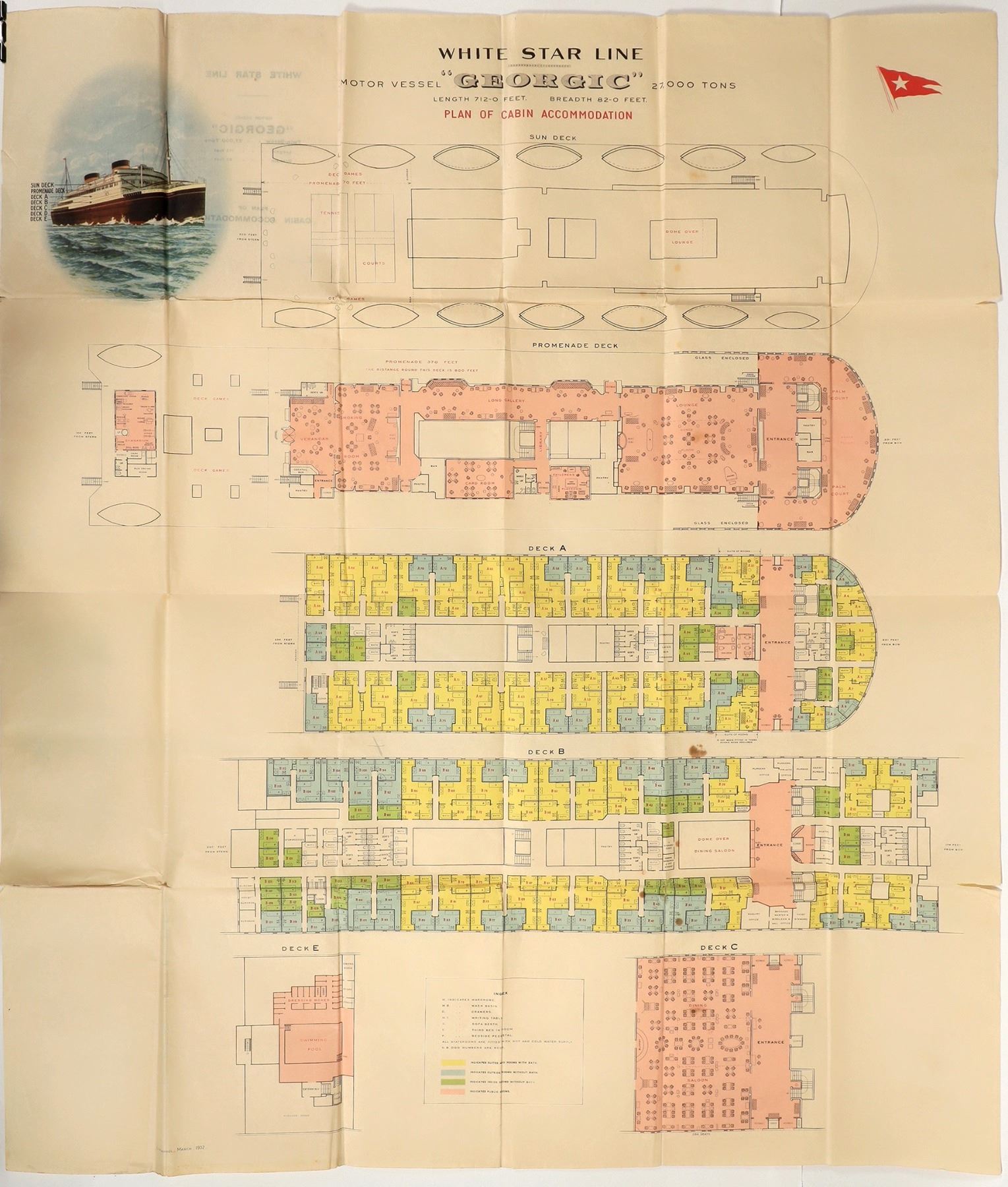White Star Line passenger steamship "Georgic", 1932. A full color "map" of the ships cabins and decks. VG condition. approx. 36x40"