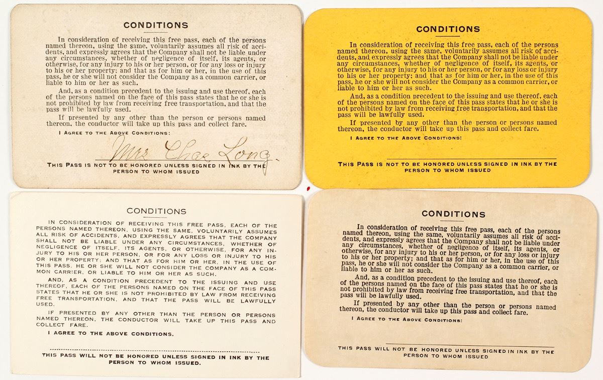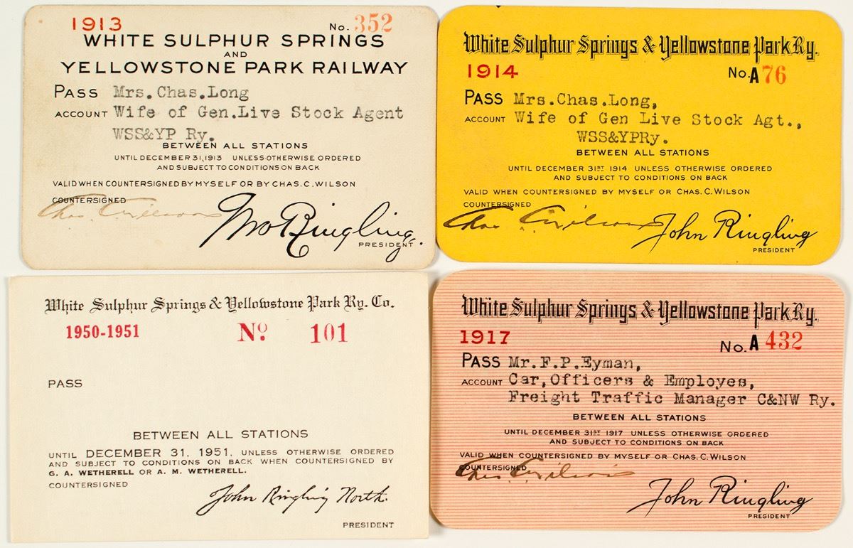 Lot of 4 different. Included: 1913, 1914, 1917, and 1950 (unissued). Stamp signed by John Ringling as president. Ringling was the most famous of the Ringling Brothers, known for their traveling circus monopoly. The town of Ringling, Montana is named for him. The railroad was built in 1910. (Prag Collection) City: State: Montana Date: Inventory# 41107