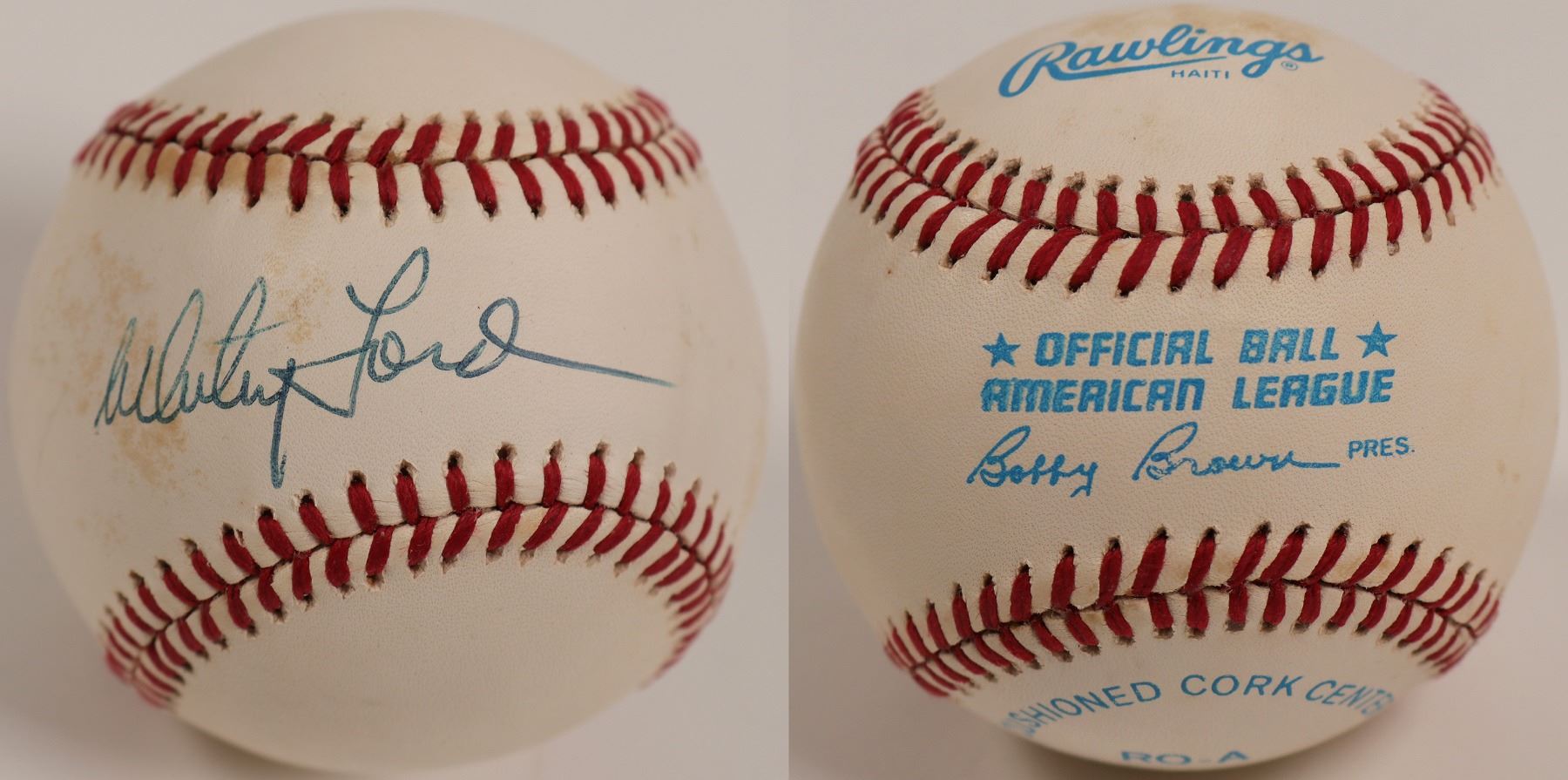 This signed baseball by Whitney Ford of the New York Yankees. The ball comes in a clear plastic display. Signature in blue ink on the center of the ball. Rawlings baseball RO-A. Ball has a bit of wear.