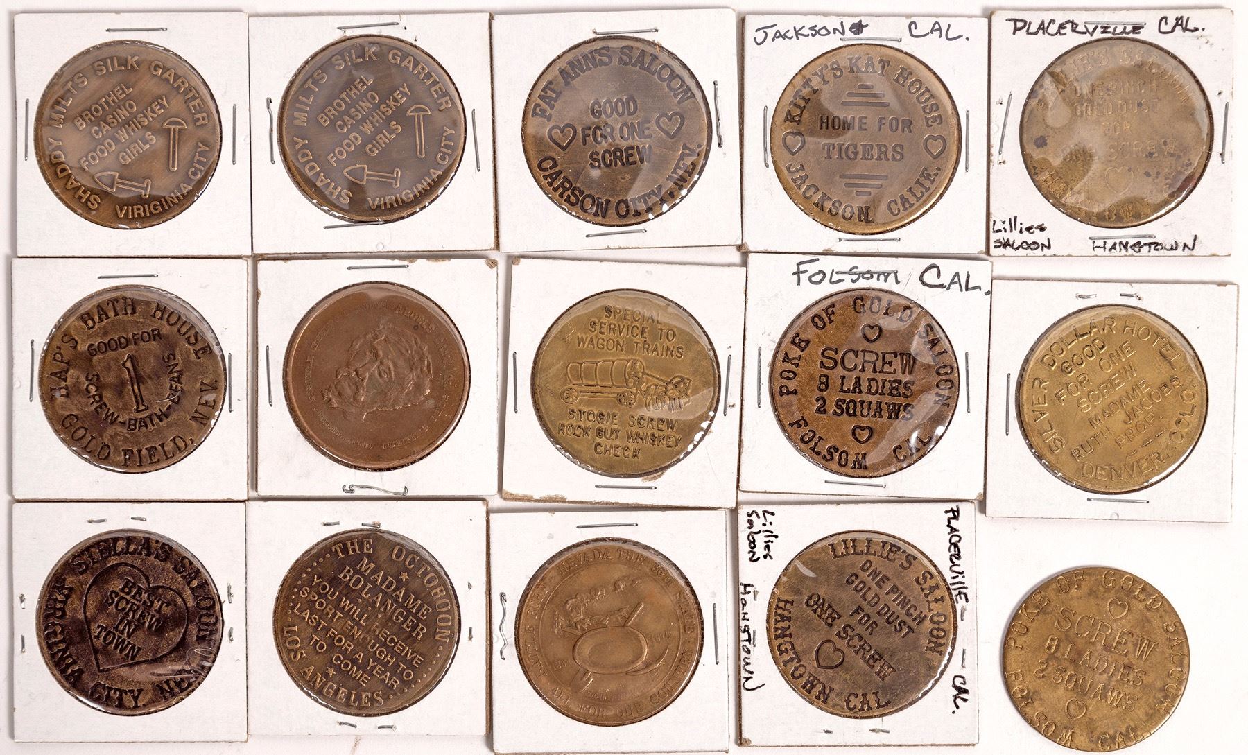 Lot of 15. Choose your poison ñ Good for All Night or $3 Check. Visit Madame Bee Jay, Stosie Screw and get some Rock Gut Whiskey, Madame Ruth Jenkins, Lillie's Saloon and good for one screw. Find pleasure in Carson City, Denver, Hangtown, Virginia City, Gold Field Nevada, Folsom, Los Angeles, El Paso. Mostly Nevada and California. Donita forget the Poke of Gold Saloon ñ Screw 8 women and 2 squaws State:Nevada City: Date: Provenance: