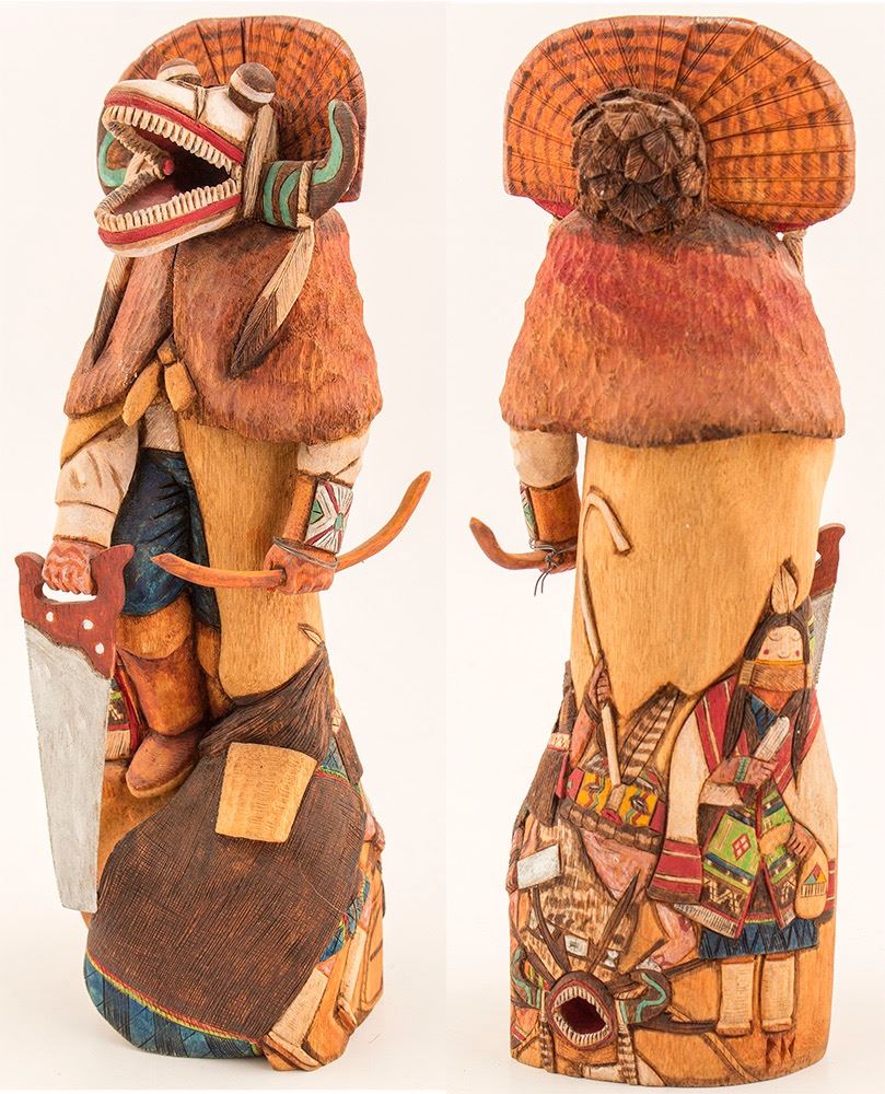 Wi Haru--White Ogre. This amazing piece is not only finely detailed, but there is a completely finished scene carved and painted on the back of the piece. The scene shows a black ogre and a corn maiden, plus two other figures--just fabulous. 10" x 3.5" x 3.5". The kachina is unsigned, but my research finds the artist may have been Brian Honyouti (1947-2016). He had started carving katsina dolls in the 1960s after graduating from high school. He helped his dad paint his dolls and learned to carve his own at that time. According to Helga Teiwes, he was the first carver to use wood preservers and wood sealers as an undercoat for the carvings. She said he was also the first to substitute wood preserver for paint and to use oil paints in lieu of acrylic paints. These innovations provided a mellow tone to his carvings rather than the shiny gloss of acrylics.