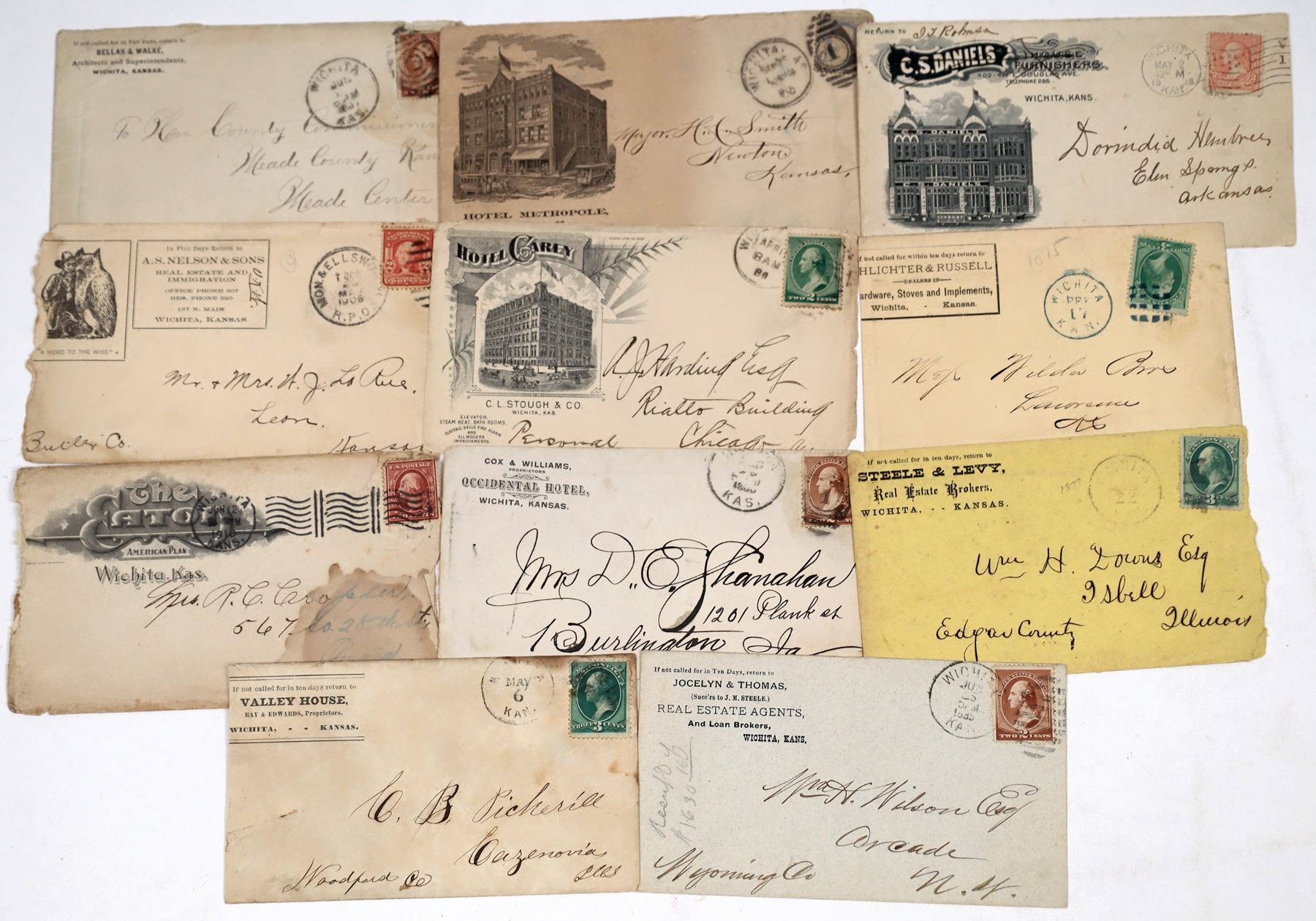 Lot of 11. Pictorial of cowboy and very large owl with "A Word to the Wise." AS Nelson & Sons real estate and immigration. Pictorial of buildings for CS Daniels house furnisher and Hotel Metropole. Other corner advertising includes Bellas & Walke architects, Valley House, Jocelyn & Thomas real estate, Steele & Levy real estate, Occidental Hotel, The Eaton, --hlichter & Russel hardware, and front only with pictorial of Hotel Carey. 1870-1900.