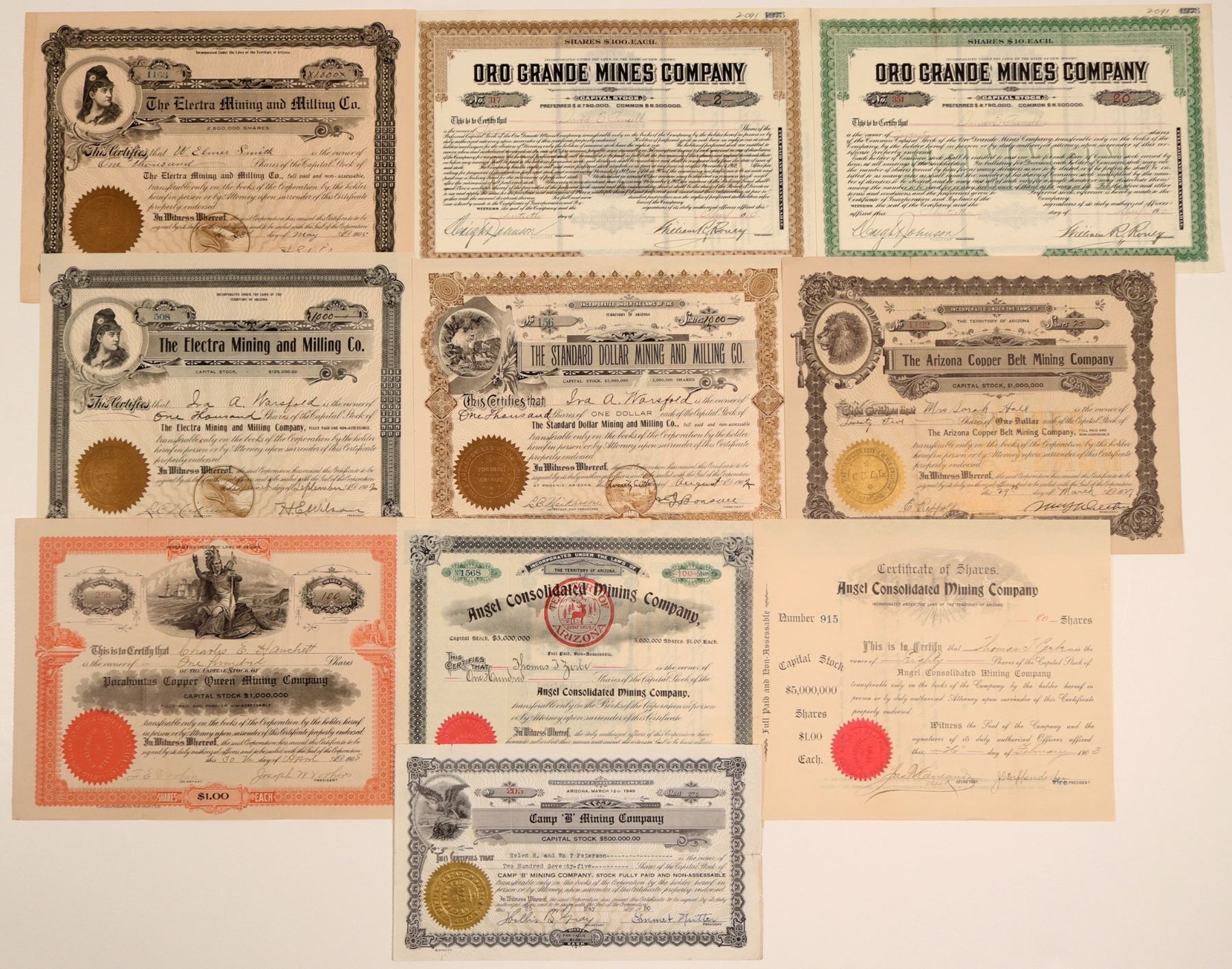 Lot of 10, good variety. Includes: Electra Mining & Milling Co. (1902 and 1905); Pocahontas Copper Queen MC (1908, Weaver District); Arizona Copper Belt MC (1927, Black Rock District); Angel Cons. MC (two different, 1903); Oro Grande Mines Co. (two different, 1910); Camp "B" MC (1950); and The Standard Dollar Mining & Milling Co. (1902). Please inspect. City: Yavapai County, Wickenberg State: Arizona Date: 1902-1950