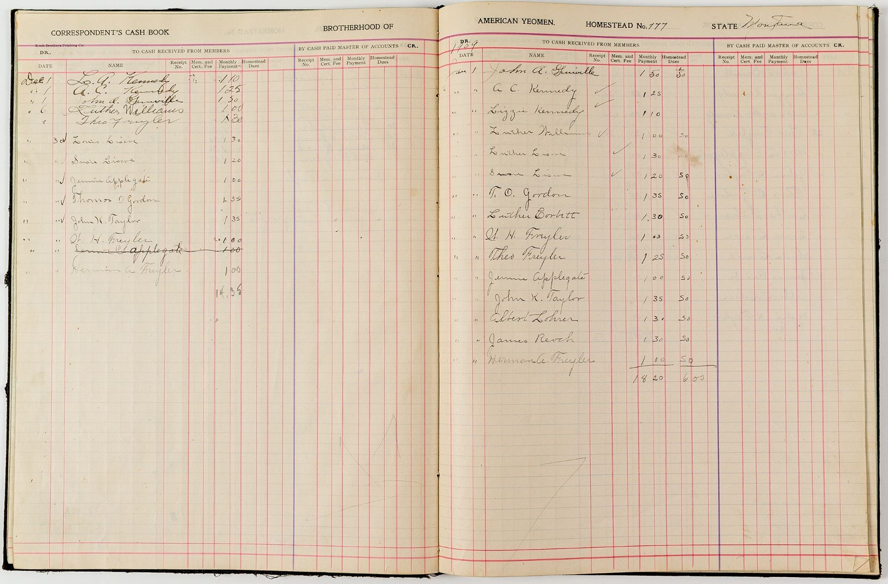 Brotherhood of American Yeomen Homestead No. 777 dues book records for some of the people in the silver mining ghost town of Wickes Montana. About 25% used, and spans from 1907-1910. Wickes was one of Montana's first boom towns and the location of the Alta Silver Mine. It went bust when the company moved the smelter to East Helena, The Northern Pacific Railroad cut off its line from Helena to Wickes and the Alta Mine shut down. State: Montana City: Wickes HWAC#: 40864 Date: 1907-1910