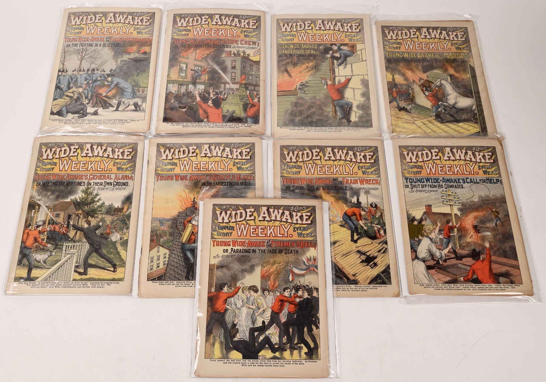 "Wide Awake Weekly", a weekly pulp style magazine by Robert Lennix, about the adventures of a boy fireman. Fascinating stories with colorful covers. 10 numbered issues in very nice condition, 1905-1908 (RARE).