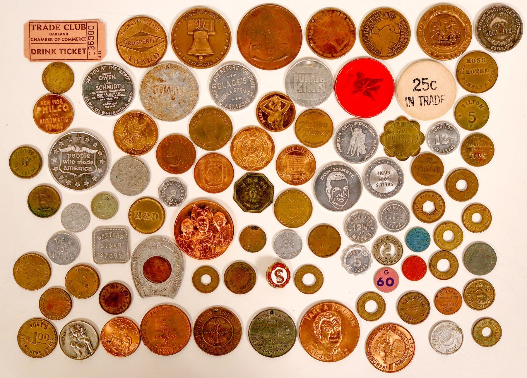 Lot of 85 tokens , a wide variety, including Mavericks. Includes: Firestone; Vogt's Sigars, News, Drinks; Hill's Drug Store; Wyman, Partridge & Co.; Mill's Novelty Co., San Francisco; Marcus Ruben, Chicago; and many more, large and small.
