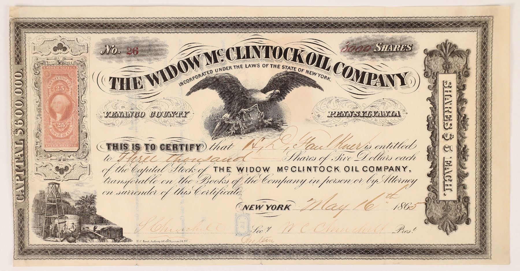 "Venango County Pennsylvania" (printed under title). Inc. in New York. No. 26, issued for 3,000 shares to HD Faulkuer in 1865. Signed by president WC Churchill and secretary Churchill. Not cancelled. Eagle vignette (top center) and oil operations (bottom left). 25 cent US IR Power of Attorney stamp attached on the left. Printed by RC Root, Anthony & Co., NY. 6 x 11.5" Folds, creases.