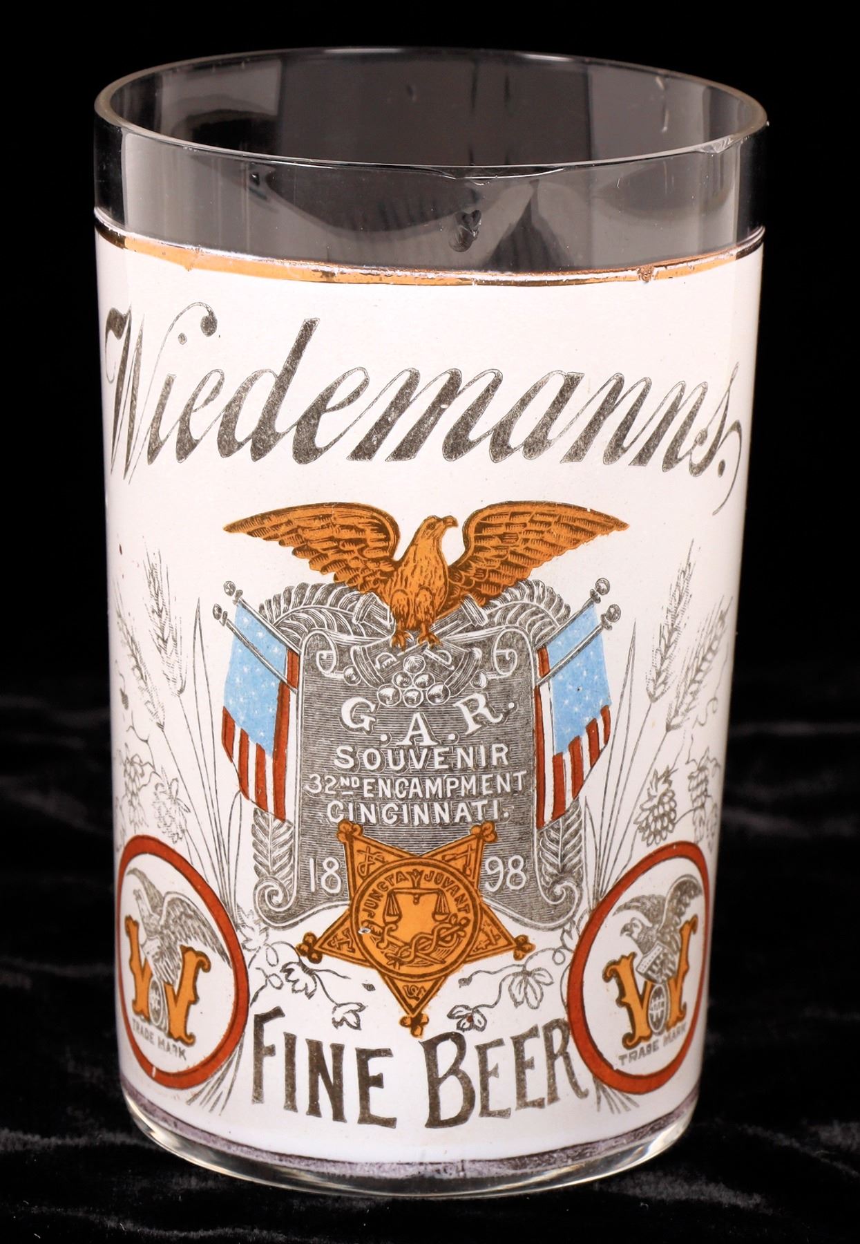 Colorful Weidemanns./G A R/Souvenir 32nd Encampment/Cincinnati 1898/Fine Beer. 3.6". A few small upper dings. Please inspect. Ohio Cincinnati
