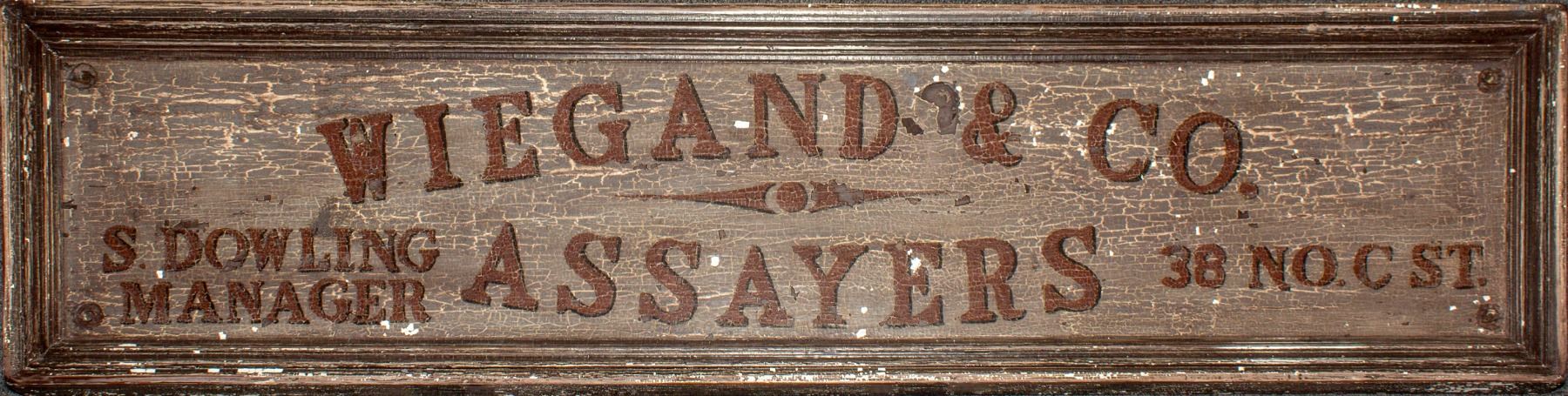 A truly fabulous piece of Comstock and Nevada history: an original sign from a famous Gold Hill and Virginia City assayer, Conrad Wiegand & Co. This original sign, found in poor condition in an attic in Virginia City, is the sign that hung on the Virginia City branch office, which was only open a short while about 1890. This sign was originally purchased from a prominent antiques dealer in Carson City. It has been completely repainted to look the same as the original, but the paint is unstable. No original paint remains visible, as would be expected from a 130 year old wood sign in the desert. This impressive sign measures 75" x 18" x 2." Chocolate brown text against brown background: "WIEGAND & CO./ ASSAYERS. S. DOWLING/ MANAGER. 38 No. C St." No identifying marks on the reverse, other than the obvious original mounting holes in the nineteenth century wood. The winning bidder may want to apply a sealant or protectant to slow or stop the paint peeling process. We have not done any restoration. Please inspect. Special pick-up arrangements must be made by the buyer.