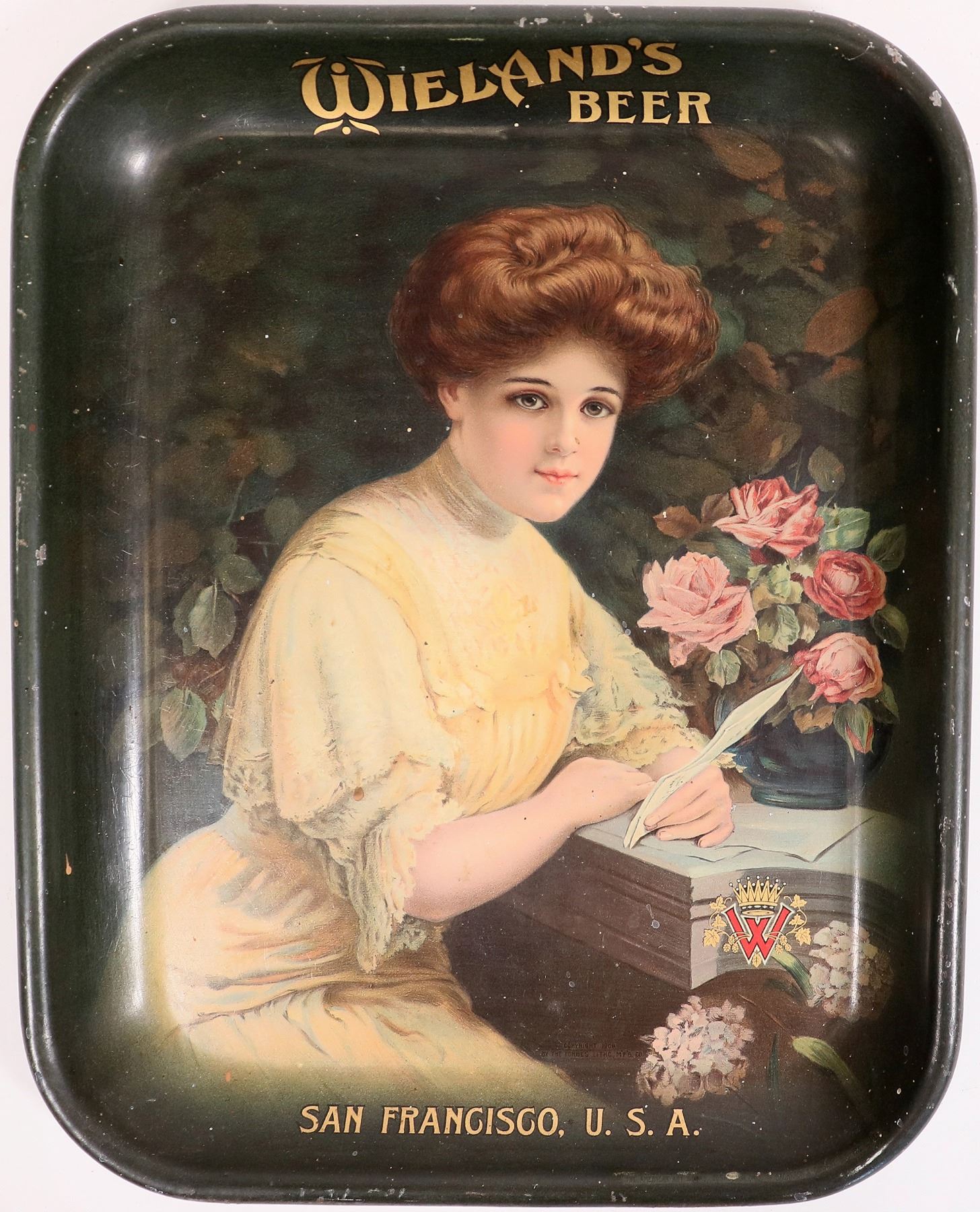 This is rectangle beer tray is from the " Wieland's Beer" Co. "San Francisco, U.S.A." 105. in. X 13.5 in. The image is of a young lady with a letter in hand. Minor scuffs in the base. Post-prohibition. San Francisco California