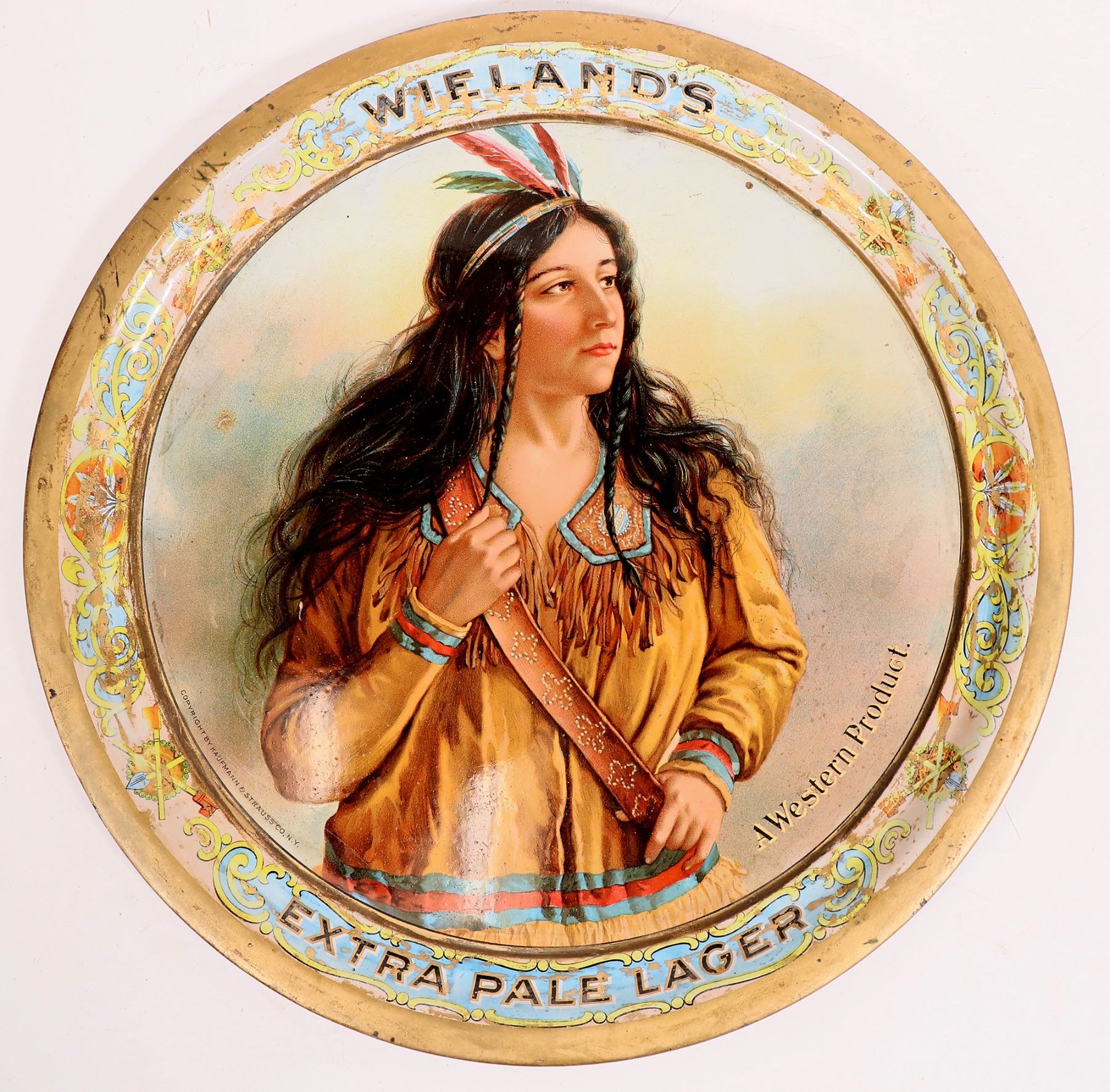 This beer tray is marked "Wieland's/ Extra Pale LAger/ A Western Product/ Copyright by Kauffman & Straus N.Y." 13 in. across with a low edge shows wear with some paint loss. The base depicts an Indian woman finely dressed in buckskin and satin trim. The base is glossy with the edge well worn, minor oxidation. Good condition, pre-pro. San Francisco California
