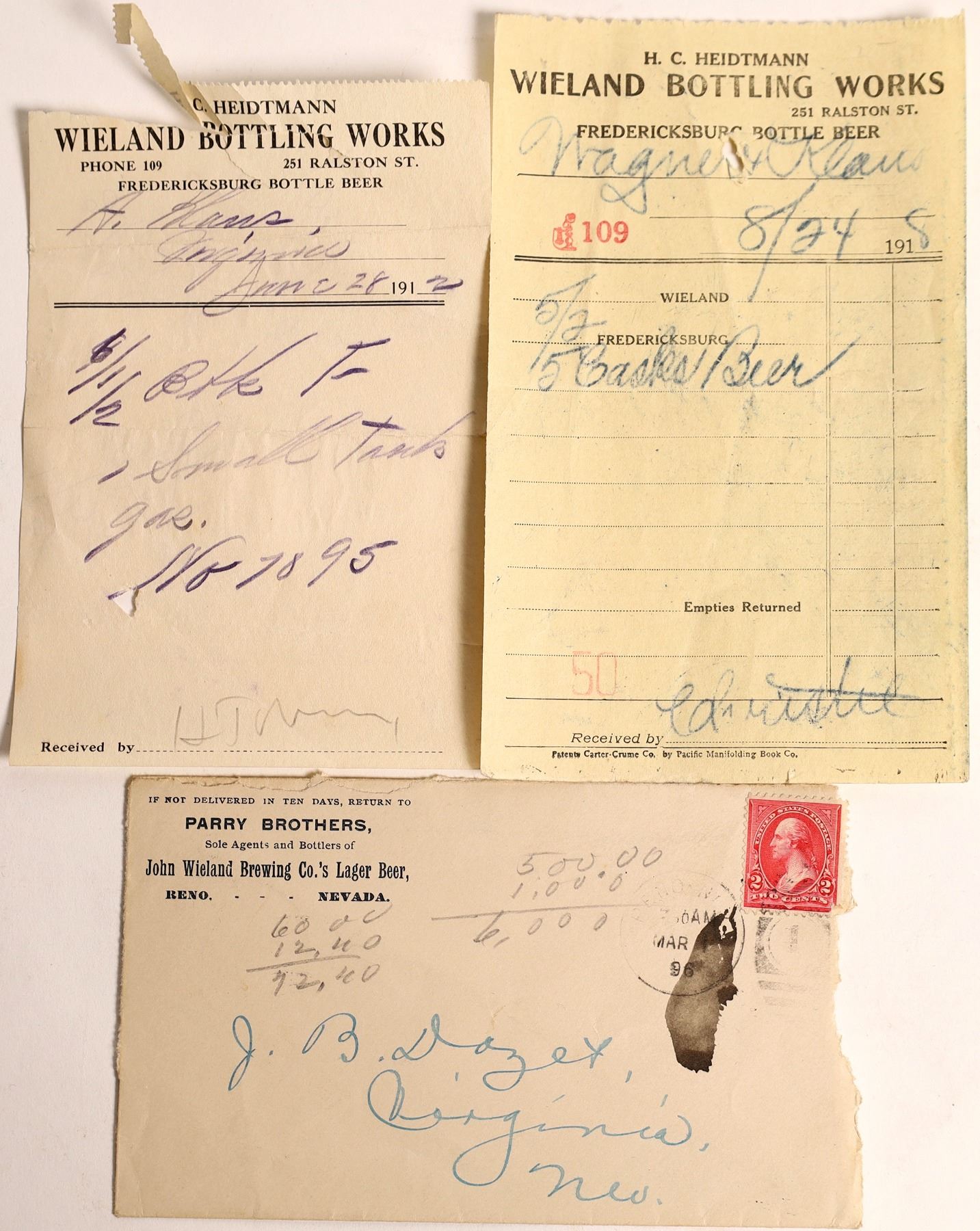 Collection of memorabilia from the John Wieland Brewing Company at 251 Ralston Street in Reno. Two receipts from 1912 & 1918; a postal cover with two cent stamp and return address of the Parry Brothers, sole agents and bottlers of John Wieland Brewing Co.'s Lager Beer; two tokens from Wieland's Park, GF 50c and GF 5c. Wieland’s Park opened in July 1905 at a point known as “Asylum Crossing,” due to its proximity to what was then called the Nevada Insane Asylum. The resort’s founder and proprietor, Otto Benschuetz, was a German immigrant and much-beloved Reno resident who managed the local agency of the San Francisco-based John Wieland Brewing Company.