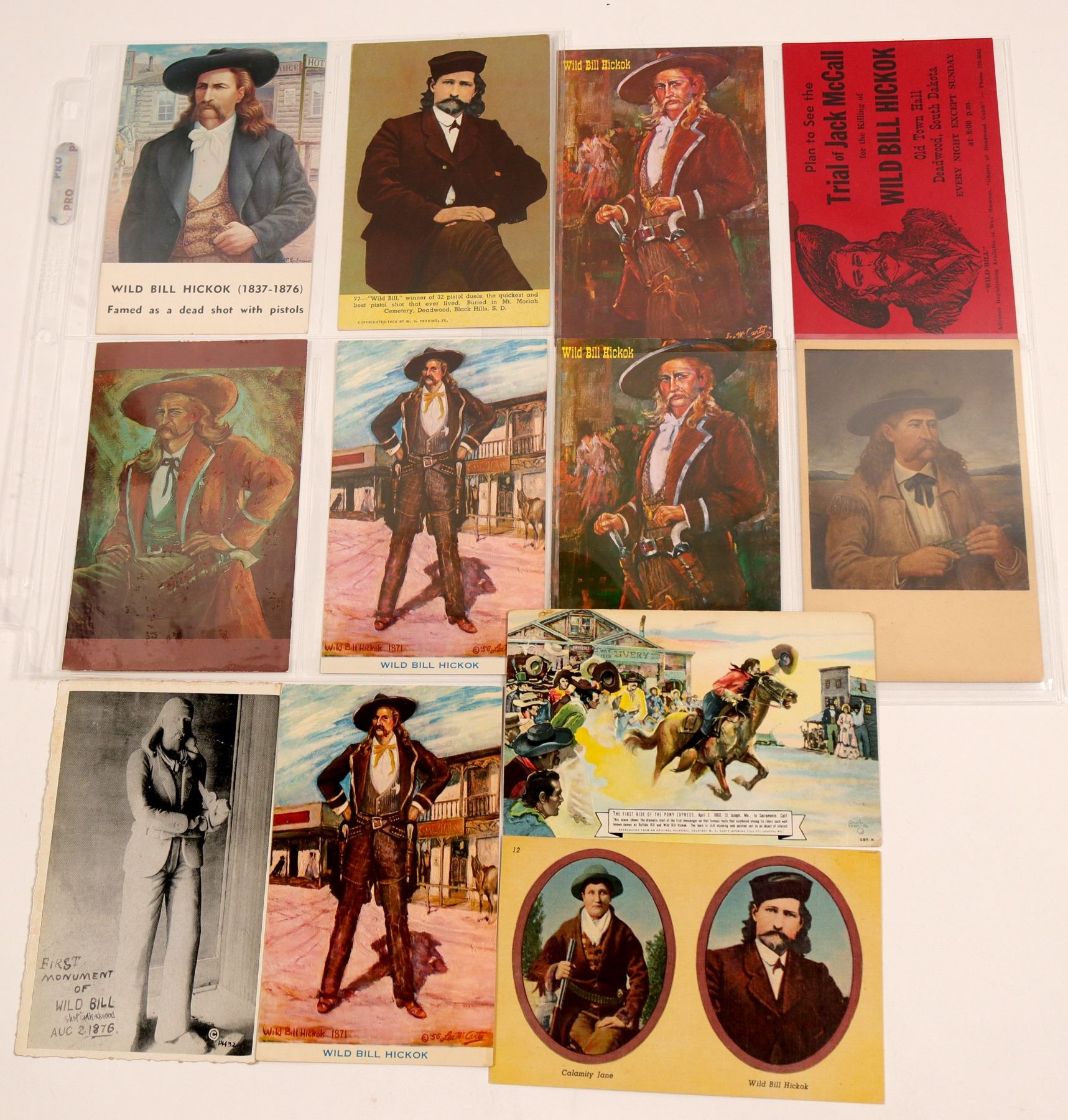 12 postcards of (James Butler) Wild Bill Hickok (1837 - 1876), former marshall of Abilene, Kansas. Born in Illinois. Won 32 pistol duels and noted as best pistoll shot that ever lived, reportedly shooting over 50 men.. Shot in the back by drunk Jack McCall at Deadwood, Dakota Territory.