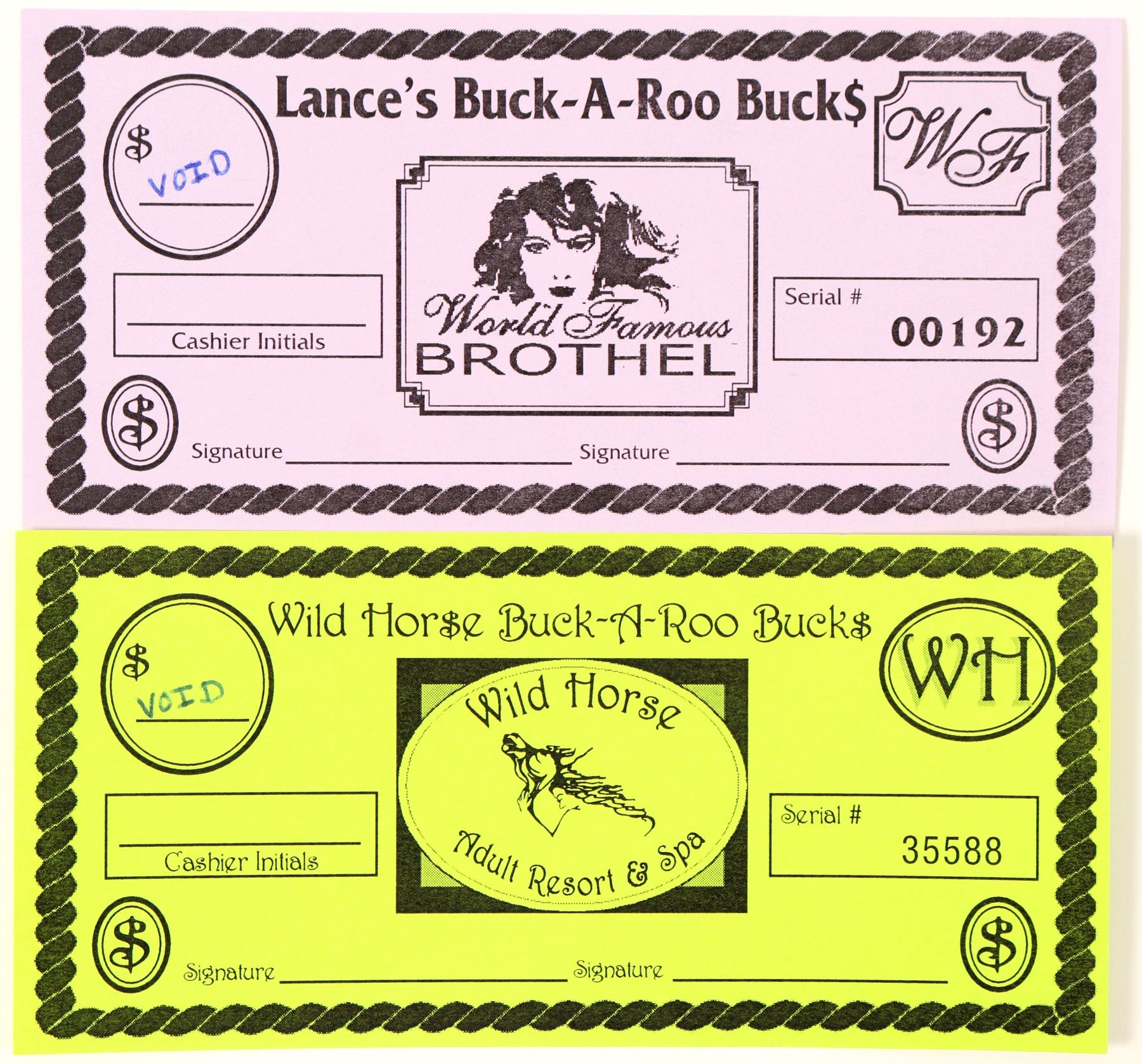 Two paper coupons, both voided, one on purple paper, another on brignt green paper. See photo for design details. Extremely rare items. Roger Merritt Token Collection