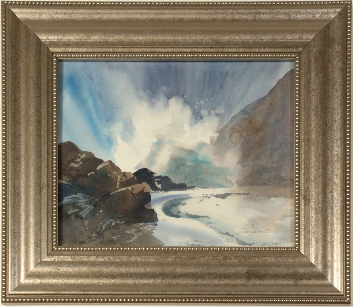 Watercolor landscape painting by Pat Bergstrom. (Framed: 17" H x 20" W). Very accomplished watercolor truly give a sense for wild waters.