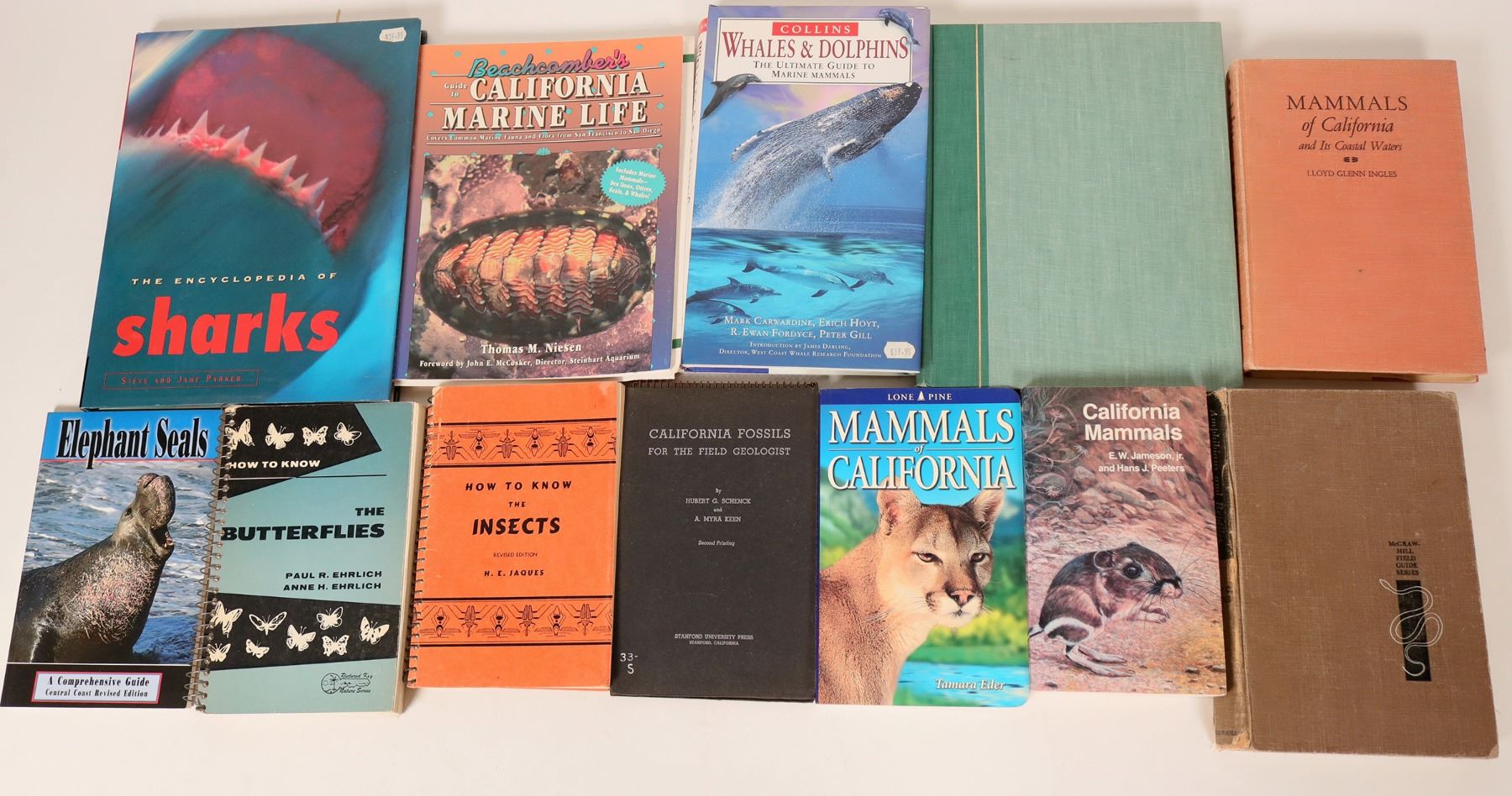 Lot of twelve books. 1.) Elephant Seals, Adams, 1999 2.) Mammals of California, Ingles, 1954 3.) Amphibians and Reptiles, Stebbins, 1954 4.) The Butterflies, Erlich, 1961 5.) California Fossils, Schenck & Keen, 1955 6.) How to Know Insects, Jaques, 1947 6.) Mammals of California, Eder, 2005 7.) California Mammals, Jameson Jr. & Peeters, 1988 8.) Living Insects of the World, Doubleday, Klots, no date 9.) California Marine Life, Nielsen, 1994 10.) Whales & Dolphins, Carwardine, Hoyt, Fordyce, & Gill, 1998 11.) Encyclopedia of Sharks, Parker, 2000