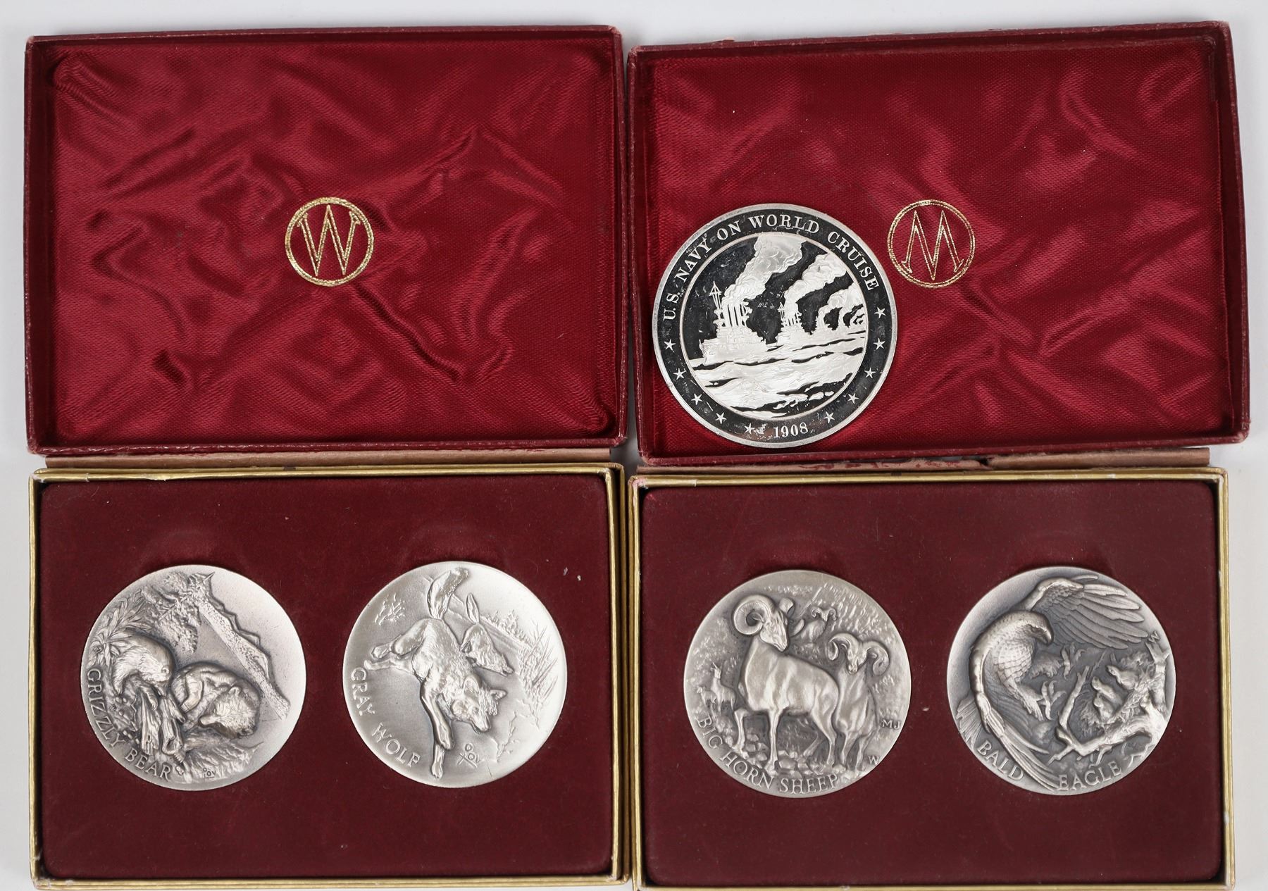 The lot features four silver rounds by Wittnauer Precious Metals Guild by Longines Symphonette set in two original boxes. The rounds feature a Plains Bison, Bald Eagle, Grizzly Bear and a Grey Wolf. In mint condition with an excellent embossed and detailed scene and story across the back. The rims are marked, "Longines Symphonette Sterling. The coins weigh 1.25 ounces each. Also a 44 mm sterling silver round (1.3 oz.): obv.: U. S. Navy on World Cruise / (pictorial steamships) / 1908; Rev.: 1908 / The "Great White / Fleet" is on worldwide/ cruise during entire year; / May 30 - National Monetary / Commission established by the / Aldrich-Vreeland Currency Act; / Nov. 3 - William Howard Taft / elected President; Nov. 30 - / Root-Takahira Agreement / eases tensions between / U. S. and Japan."