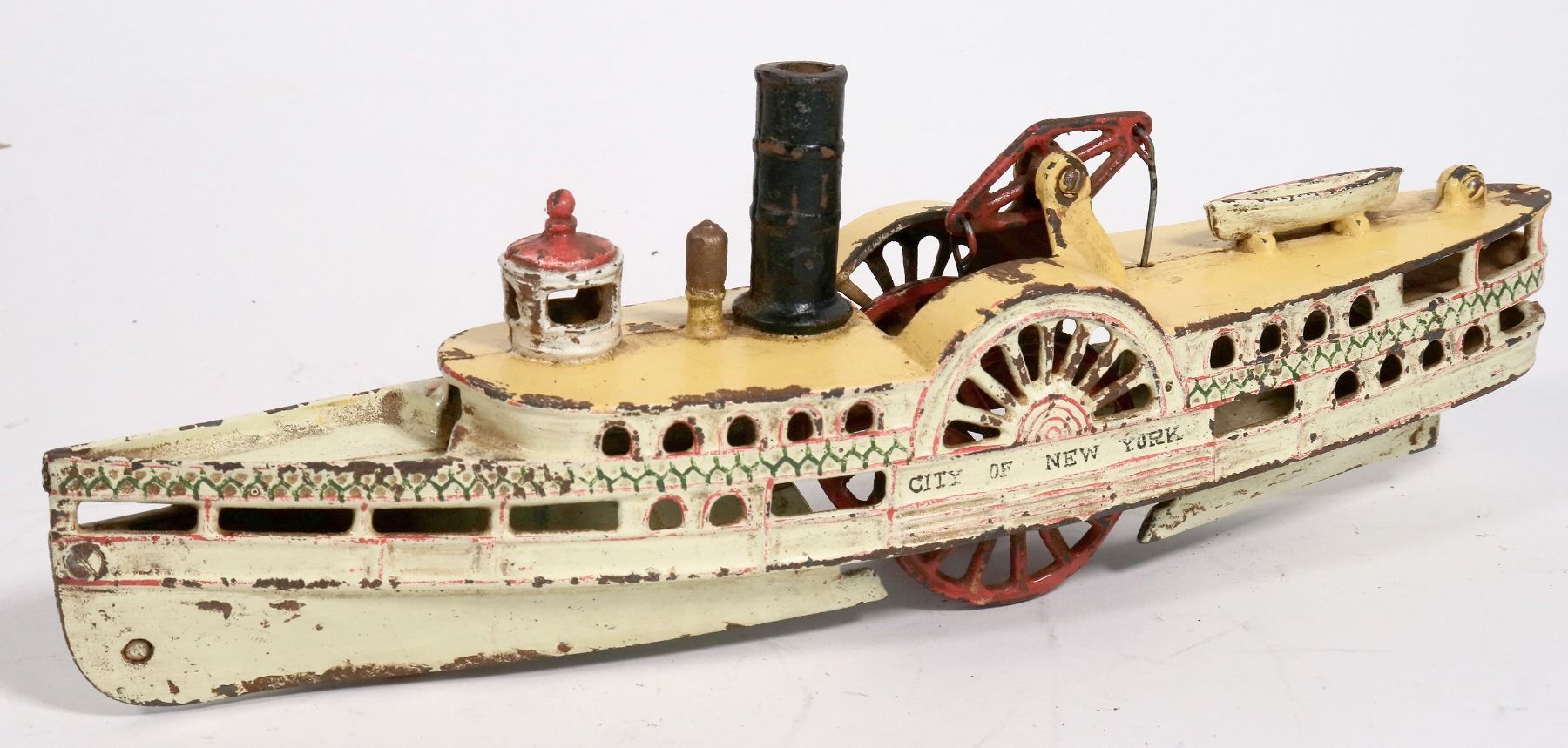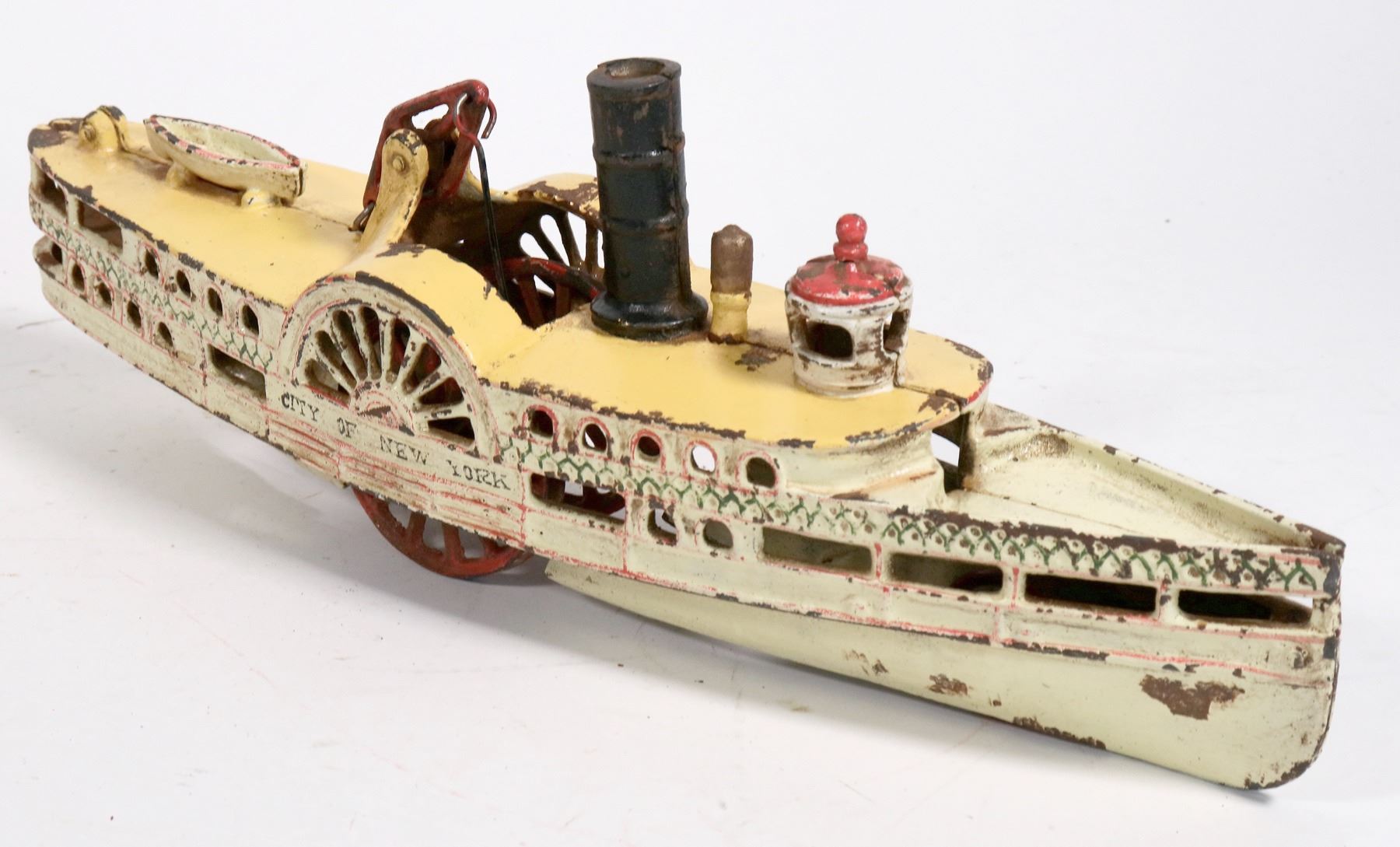 Wilkens Cast Iron City Of New York paddle wheeler. Length 15 MInus a clean up this is in excellent cond. Paddle wheels are complete, connected to the top lever and in very good working condition. Has some paint wear, but no major breakage. Wilkins Mfg. made this toy from 1890-95. 1890-95